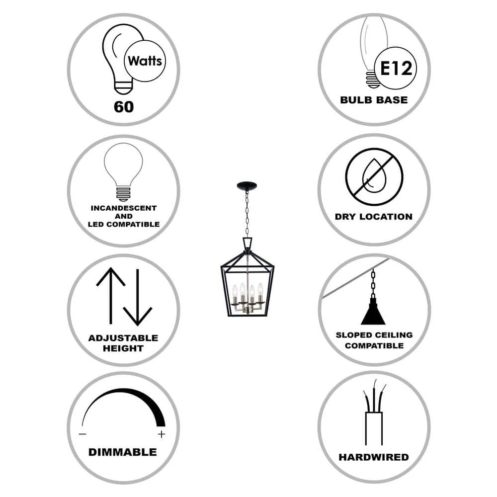 - Uses (4) 60-watt candelabra base bulbs, not included