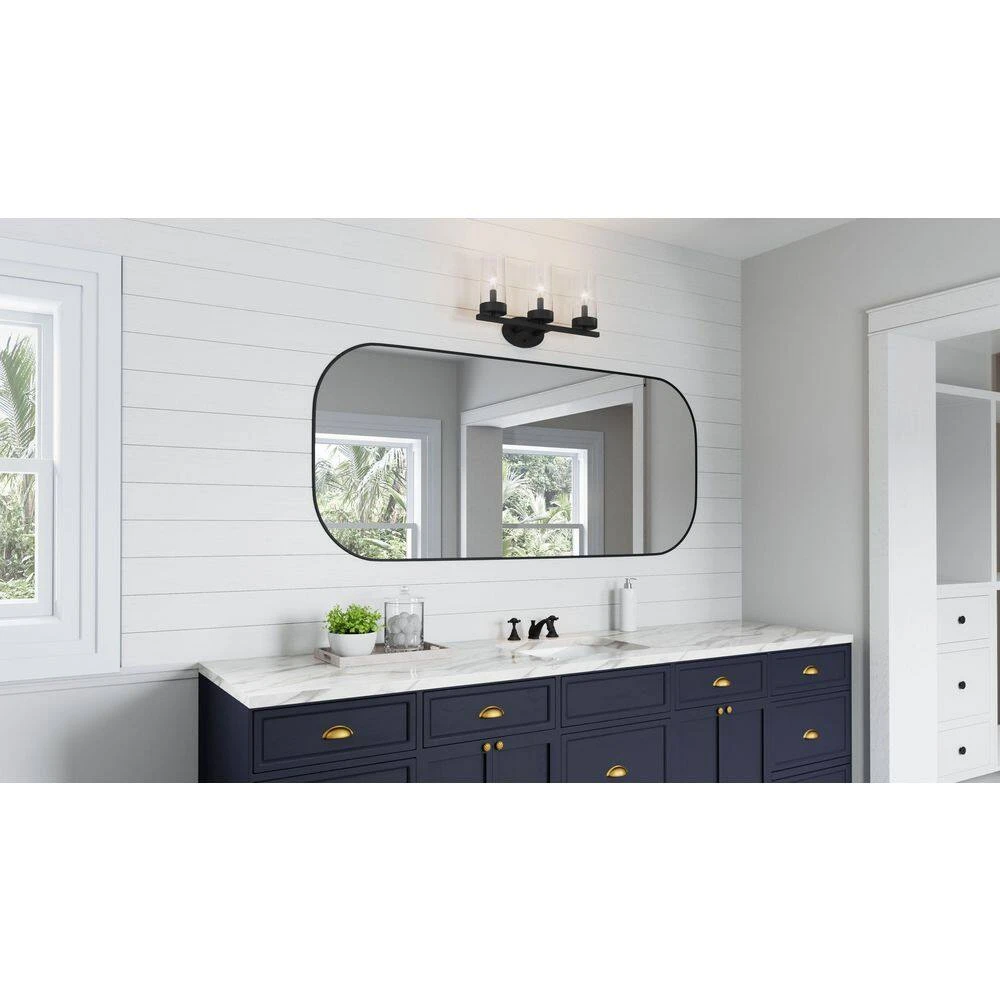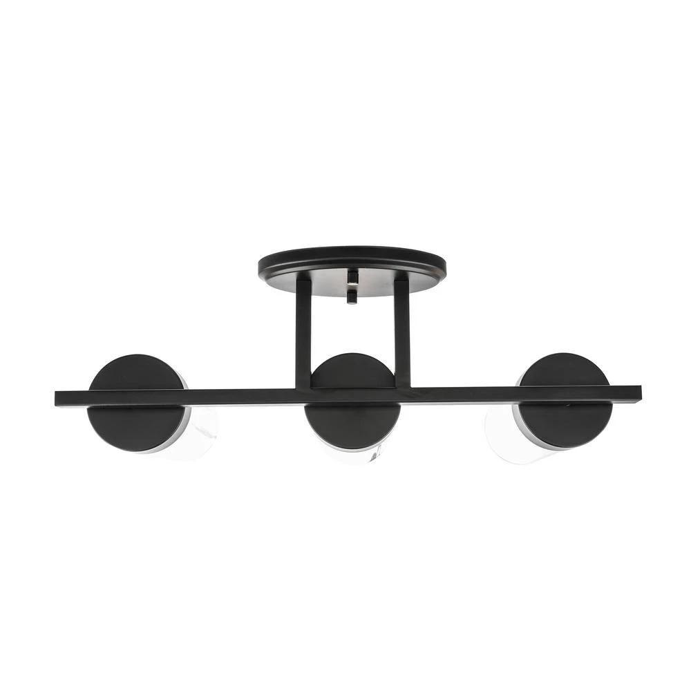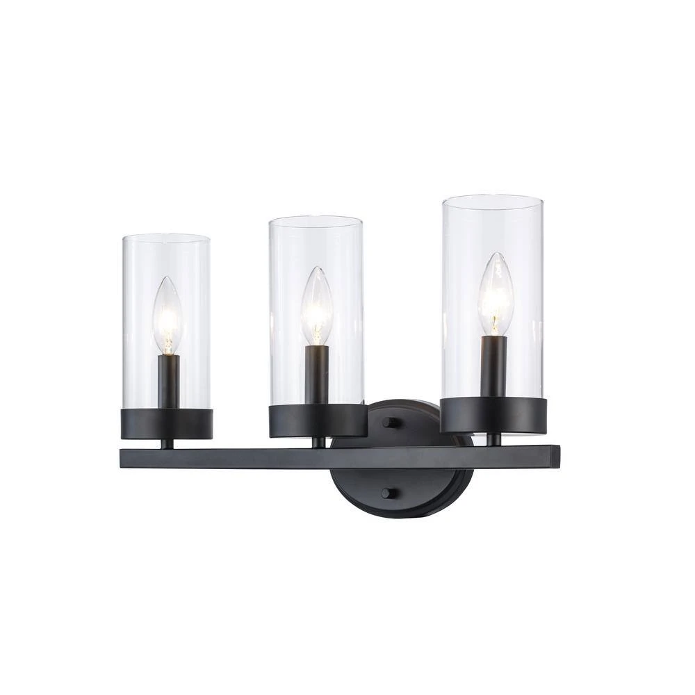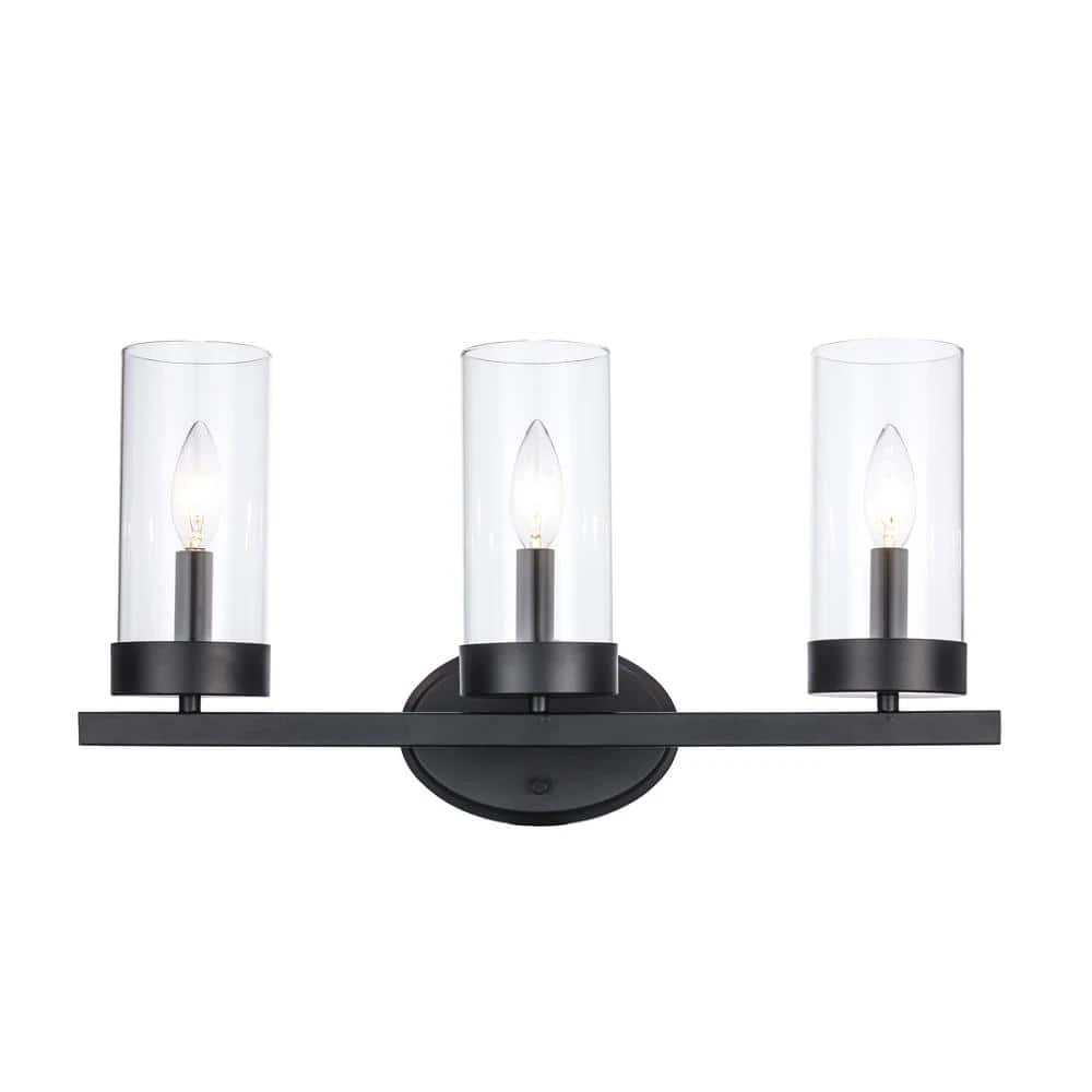 The Meadowlark Collection from Bel Air exhibits contemporary indoor lighting designed to suit a variety of home decor styles from transitional to modern. The Meadowlark vanity fixture is a decorative wall light that works well in bathrooms and powder rooms. Use as a single unit in smaller spaces or use as a set over a double sink or vanity mirror in larger areas. The fixture is constructed of black finished metal and includes an oval wall plate with a simple support rail that holds the glass shades in place. The clear glass shades are cylinder shaped, each house a single light bulb and are open at the top for easy access to change the bulbs. Shop the Meadowlark Collection for coordinating interior lighting for the whole house.