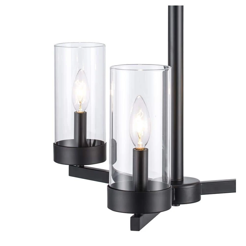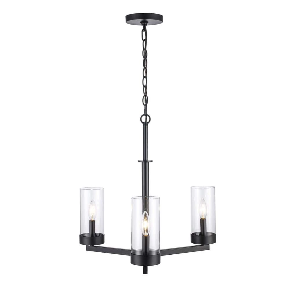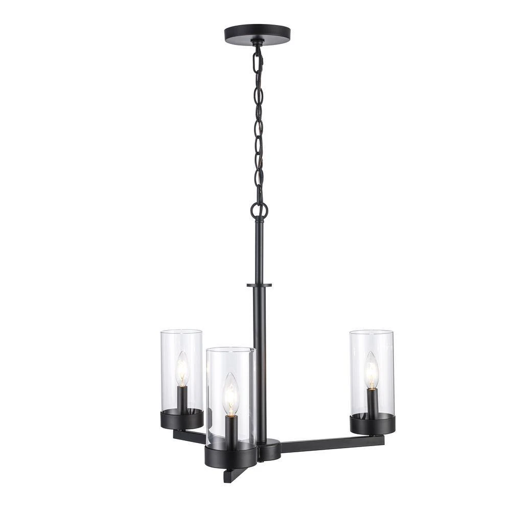 The Meadowlark Collection from Bel Air exhibits contemporary indoor lighting designed to suit a variety of home decor styles from transitional to modern farmhouse. The Meadowlark cluster chandelier is a decorative hanging light that works well in dining areas, kitchens and foyer entrances. Use as a single unit over a dining room table or install as a set over a linear kitchen island or bar table for additional illumination in larger spaces. The fixture is constructed of black-finished metal and includes a circular ceiling plate and a traditional chandelier shape with 3 arms that extend from a central support rod to hold the glass shades in place. The clear glass shades features a cylinder shape, house a single light bulb each and are open at the top for easy access to change the bulbs. The chandelier body hangs from a matching black chain, offering height adjustability and sloped ceiling compatibility. Shop the Meadowlark Collection for coordinating interior lighting for the whole house.