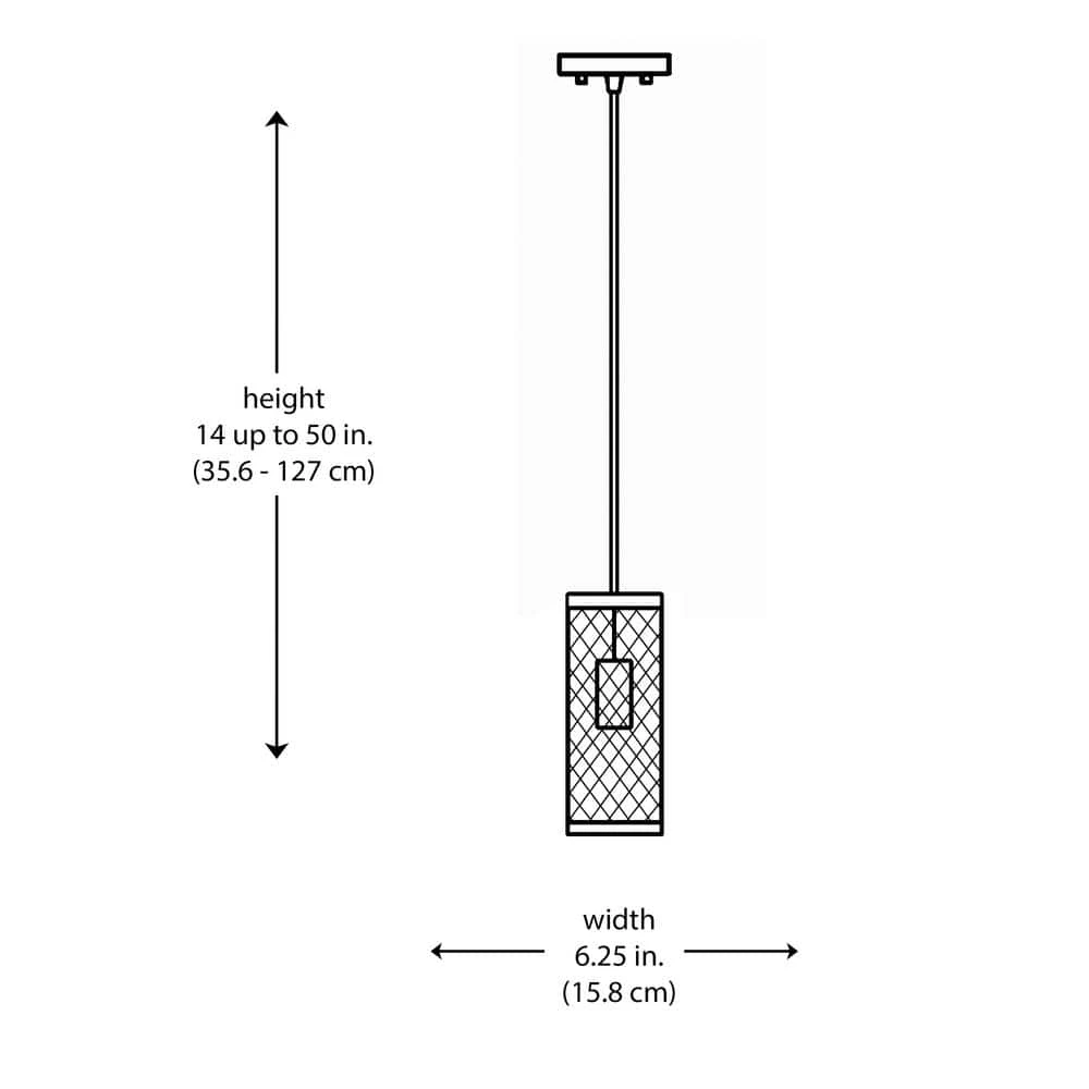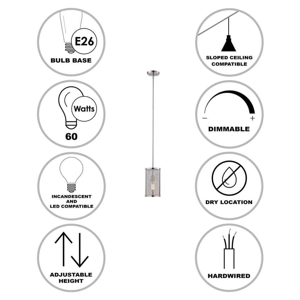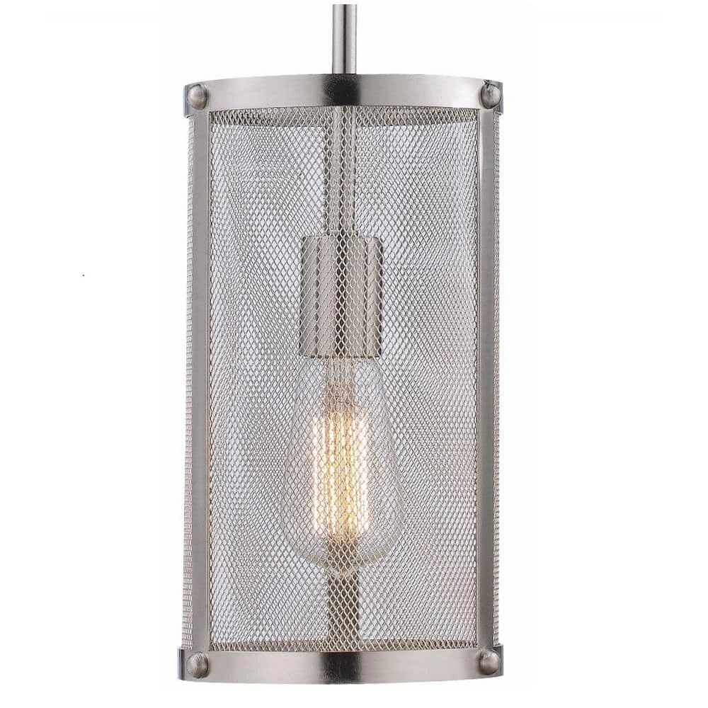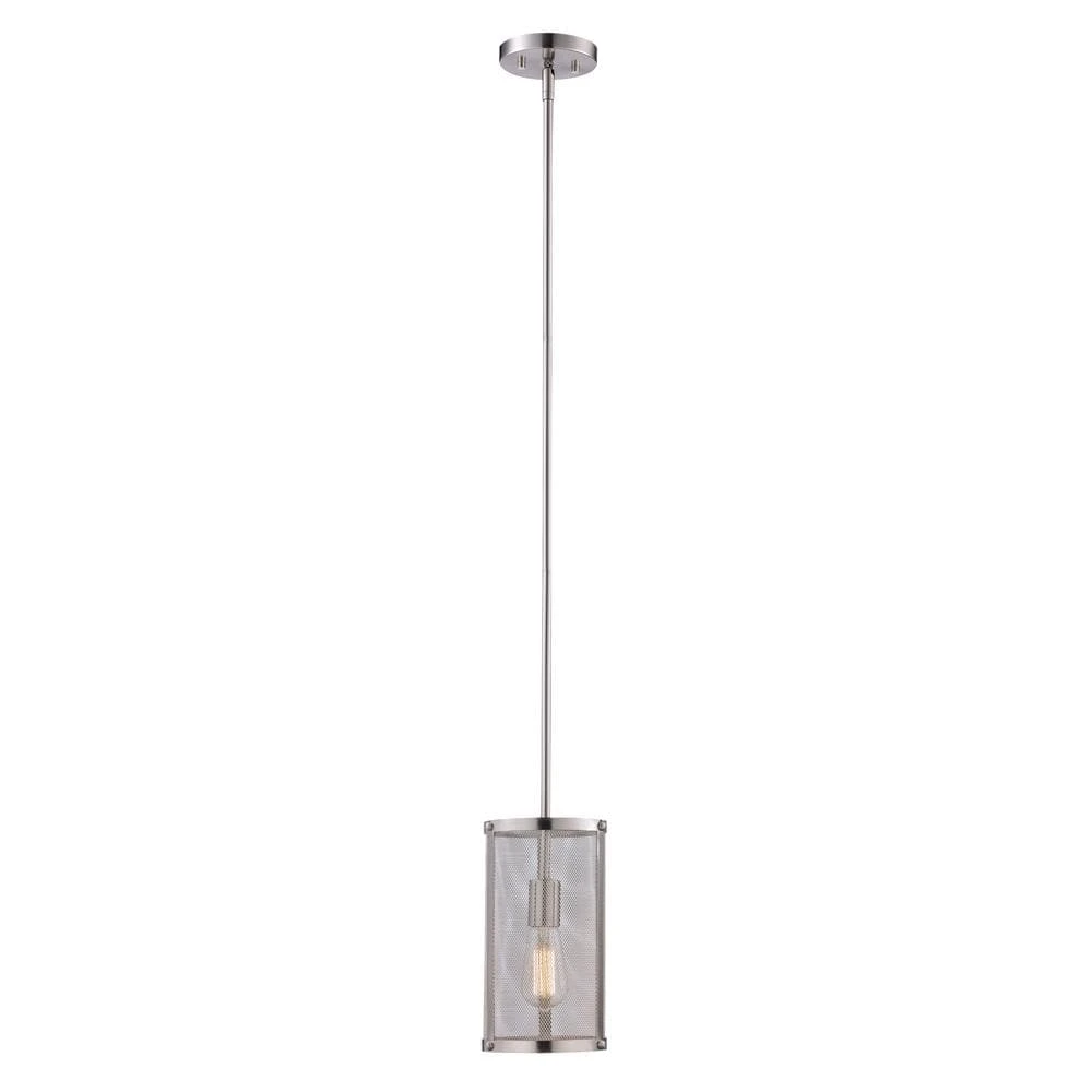 The Mesh Collection from Bel Air exhibits industrial style interior lighting with multiple designs and finishes options to choose from. The Mesh mini pendant provides focused light to smaller spaces when hung as a single unit, or can be mounted as a series along a kitchen island or bar area for additional task lighting. A brushed nickel cylindrical shade houses the single 60-watt light bulb, and suspends from a matching extension rod and round ceiling plate. Various sizes of extension rods are included for an adjustable height. The ceiling plate includes angle mount hardware, allowing the Mesh mini pendant to be mounted on sloped ceilings. This unique collection will add style and an interesting design to kitchen areas, dining rooms, and more.