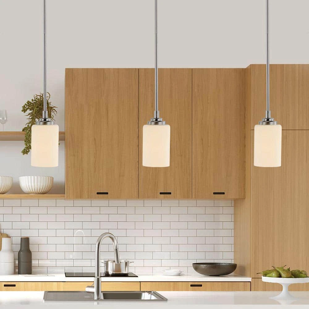 The Mod Pod Collection from Bel Air combines modern design themes with functionality, exhibiting unique interior lighting suitable for a variety of home types. The Mod Pod single light mini pendant features a metallic brushed nickel finish contrasted with a white, frosted glass cylinder shade. The opaque glass provides diffused light while the open bottom design allows for directional lighting below. A single 60-watt bulb is housed inside the shade, and is dimmable when used with a compatible dimmer switch. The contemporary tone is highlighted by the clean and simple lines present throughout the piece, making the Mod Pod pendant easy to coordinate with traditional, modern, and transitional decor styles. The pendant body hangs from a matching round ceiling canopy and various lengths of extension rods that can be added or removed for an adjustable height. This distinguished indoor pendant functions well as a single-piece, but also makes a bold statement when used in multiples over a kitchen island or linear dining room table.