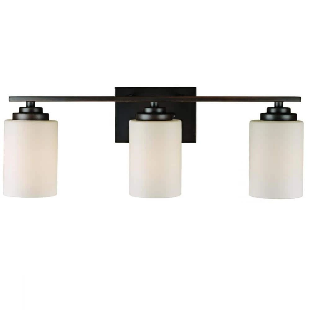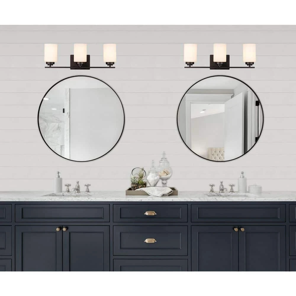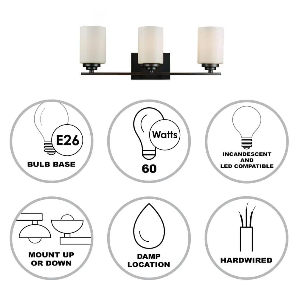 The Mod Pod Collection combines modern design themes with functionality, exhibiting unique bathroom lighting suitable for a variety of interior decor styles. The Mod Pod 22 inch wide vanity light is finished in rubbed oil bronze, designed to coordinate with existing bronze bathroom hardware. Three frosted glass shades are attached to the rectangular wall plate by straight arm detail. The offset of the dark finish with white frost lends itself to a contemporary farmhouse feel. A single 60-watt bulb is housed inside each of the cylindrical shades, offering ample task lighting for bathroom and powder room areas. The shades are open at the top to allow for easy access to change the bulbs, and for directional lighting. The Mod Pod vanity collection can be mounted upwards or downwards for a customized look.
