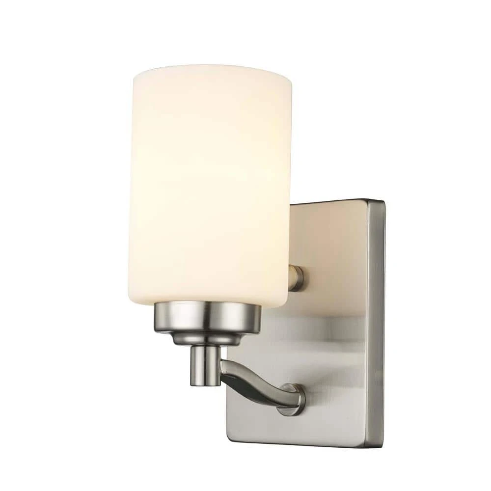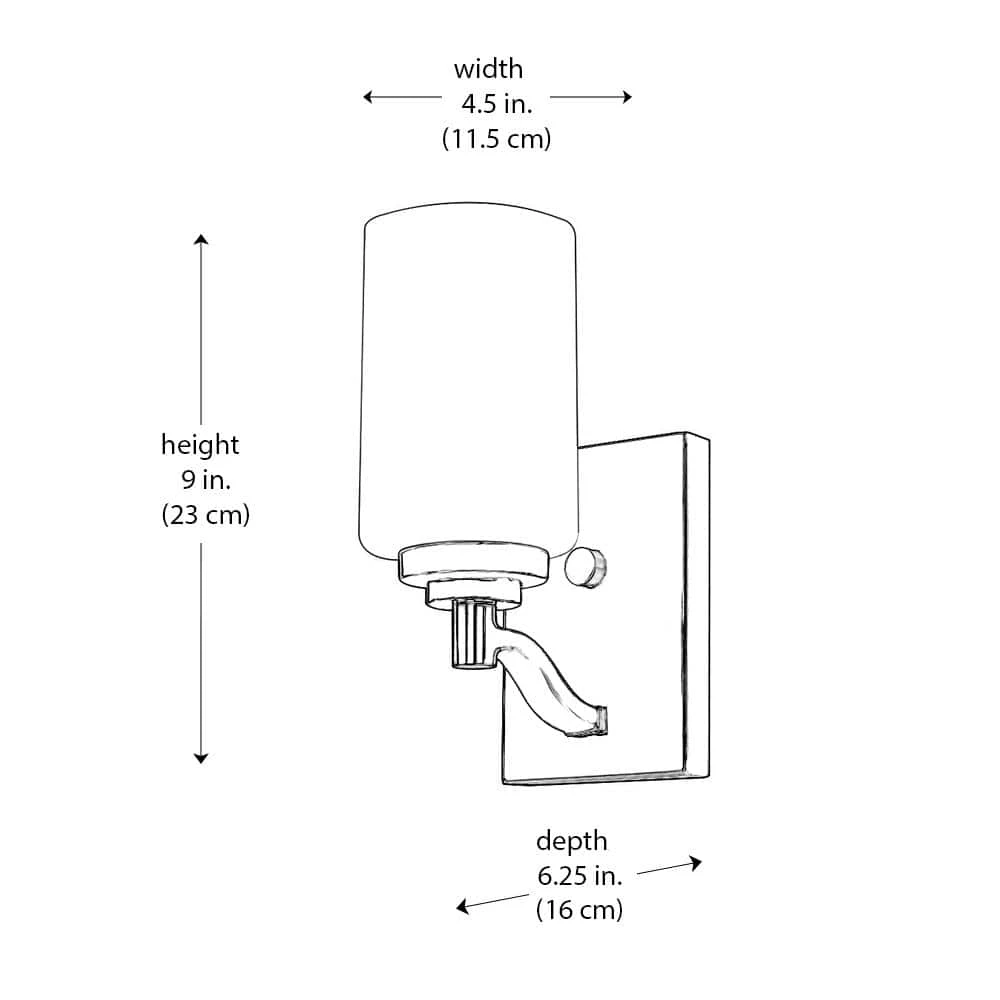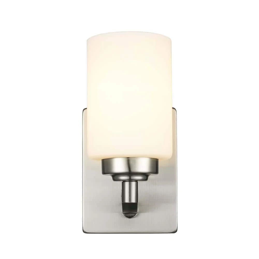 The Mod Pod Collection from Bel Air combines modern design themes with functionality, exhibiting unique bathroom lighting suitable for a variety of interior decor styles. The Mod Pod single light wall sconce has a brushed nickel finish, designed to coordinate seamlessly with existing nickel fixtures and bathroom hardware. A white frosted glass cylinder-shaped shade is attached to a nickel wall plate atop a curved decorative arm. The offset of the metallic metal with the white frost lends itself to a contemporary feel. The shade is open at the top to allow for easy access to change the bulb, and for directional lighting above or below the fixture as this wall sconce can be mounted facing up or down. Mount on either side of a vanity mirror, in hallways, bedrooms, entryways, or wherever additional illumination is needed in your home. Shop the Mod Pod Collection for additional finishes and coordinating interior lighting.