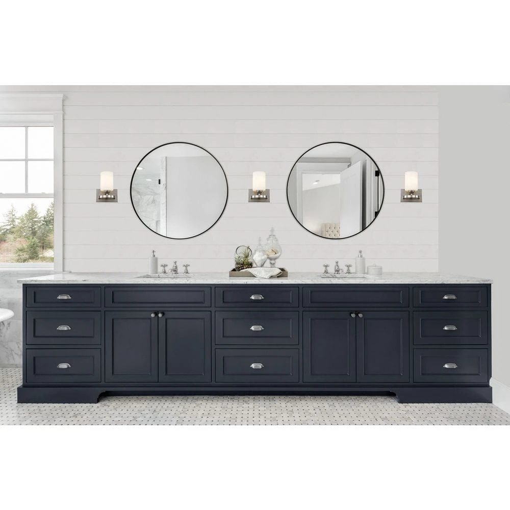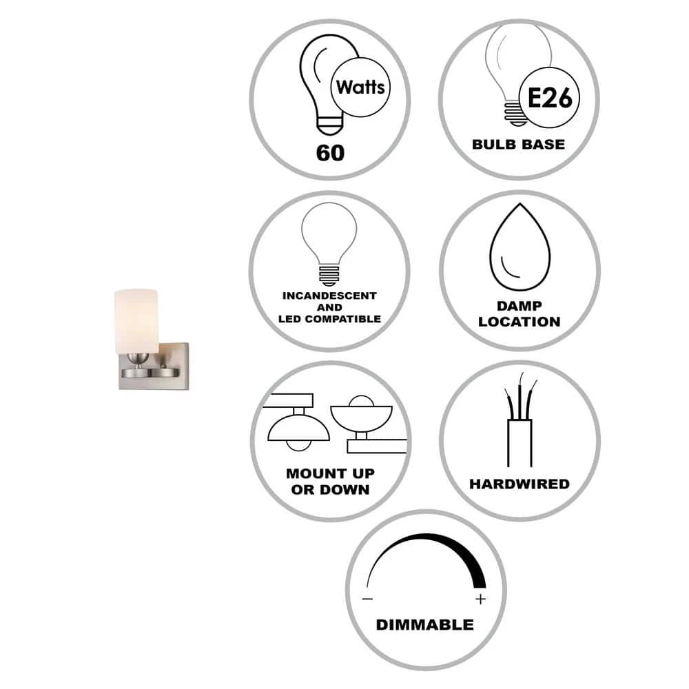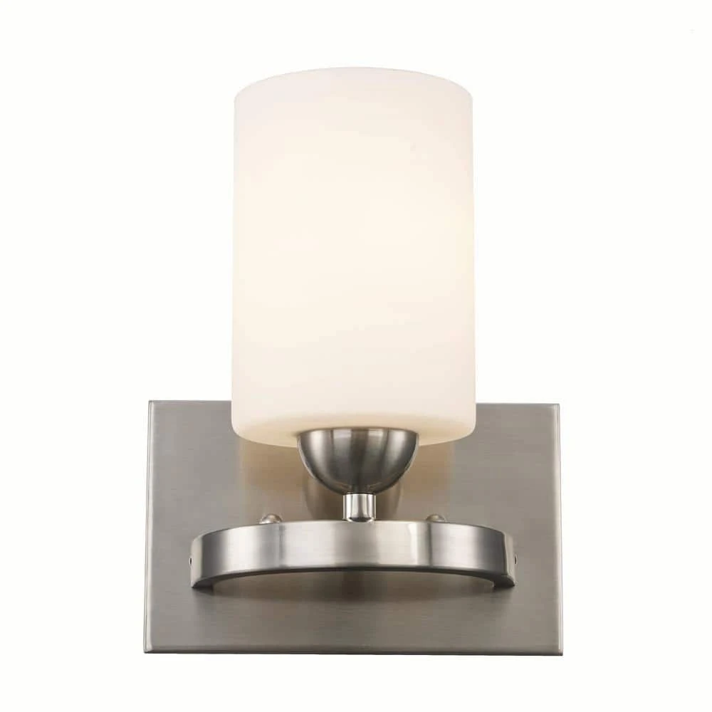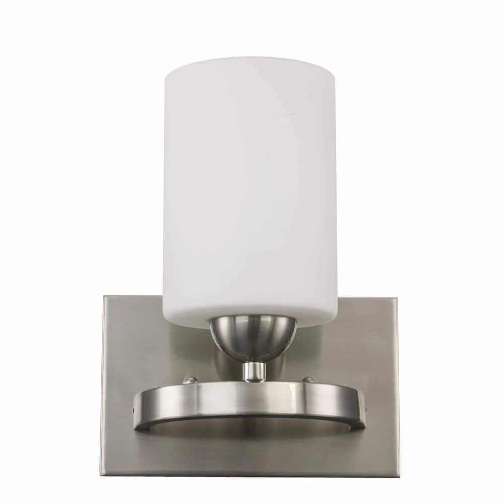 The Moonlight Collection from Bel Air exhibits modern bathroom lighting designed to suit a variety of home decor styles from transitional to contemporary. The Moonlight armed sconce is a decorative wall light that works well in bathrooms and powder rooms. Use as a single unit in smaller spaces or use as a set on either side of a sink or vanity mirror in larger areas. The fixture is constructed of brushed nickel-finished metal and includes a rectangular shaped wall plate with a delicately curved half-moon support structure that holds the glass shade in place. The frosted glass shade is cylinder shaped, house a single light bulb, and is open at the top for easy access to change the bulb. This wall sconce can be mounted with the shade opening pointed upwards or down for a customized look, and for directional lighting either above or below the fixture. Shop the Moonlight Collection for coordinating vanity light fixtures to complete your bathroom renovation.