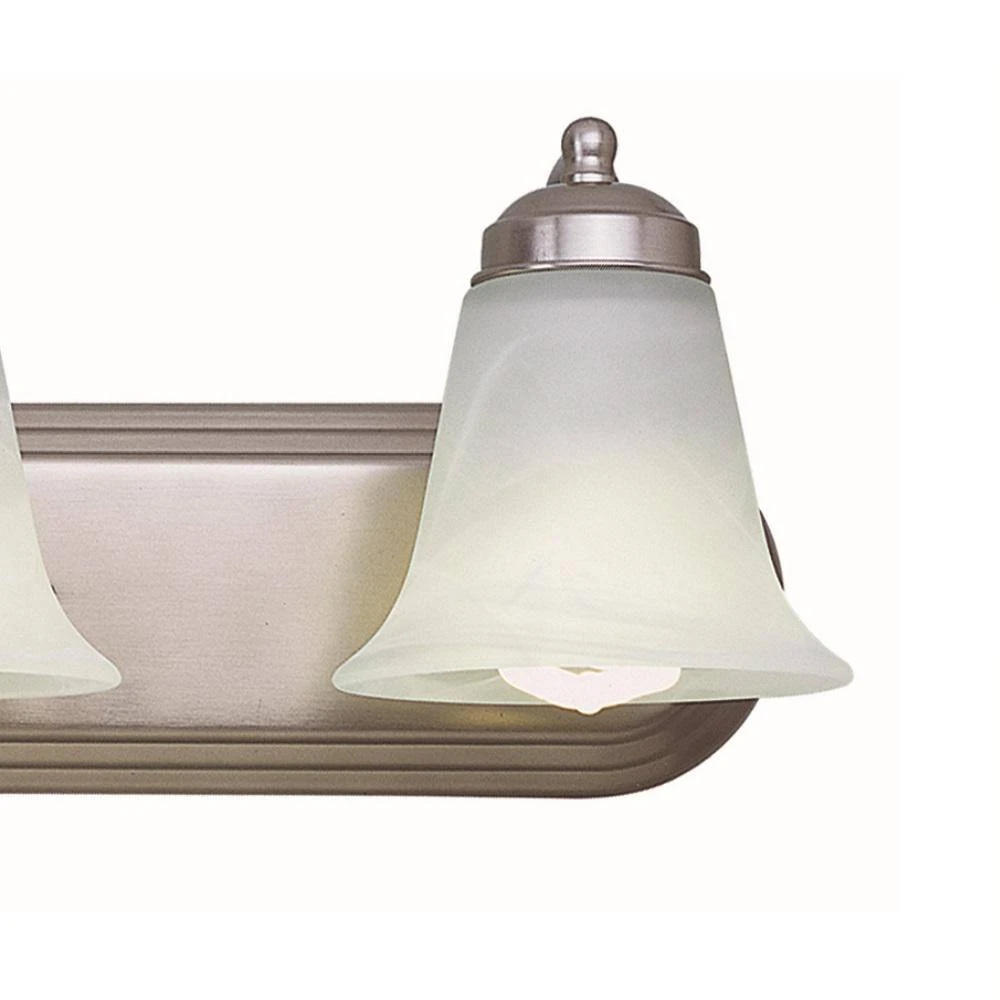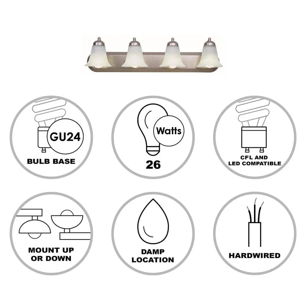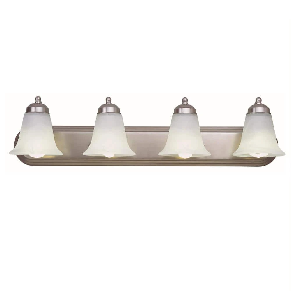 The Morgan Collection from Bel Air presents traditional style vanity lighting with elegant, marbleized glass shades and multiple size options to choose from. The Morgan 4-light vanity bar is finished in a sleek brushed nickel, designed to blend seamlessly with a variety of bathroom and powder room decor styles and existing hardware. The 30 inch wide size fits perfectly over medium to large sized vanity sinks and mirrors. Each of the four bell-shaped shades houses a single bi-pin base CFL bulb (not included) and is open at the base to allow for directional lighting. CFL or LED bulbs can be used for energy efficiency. Each piece in the Morgan family can be mounted with the shades facing upwards or downwards for a customizable look.