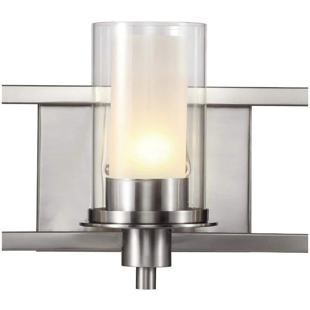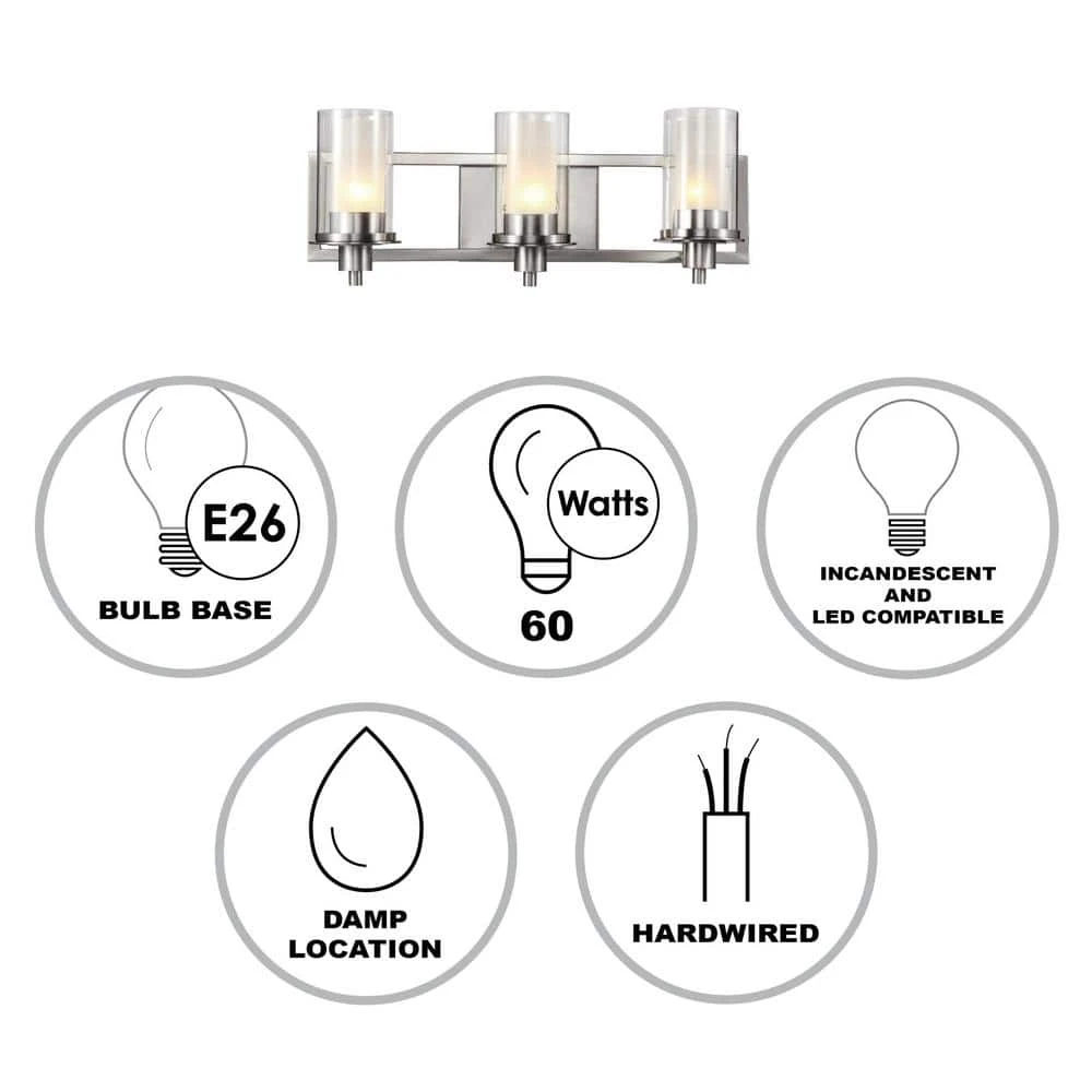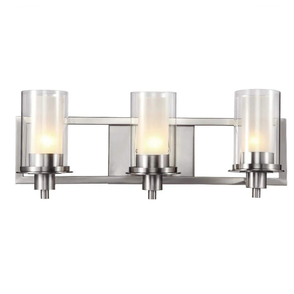 The Odyssey Collection from Bel Air exhibits modern vanity light with a unique, two-shaded design. The Odyssey 22 inch vanity bar uses three 60-watt light bulbs, each surrounded by a frosted glass cylindrical inner shade and clear glass outer cylinder shade. The dual-paned shades provide both style and functionality to the piece; the frosted glass ensures warm and even illumination from the bulbs within while the clear glass adds a touch of contemporary design and visual interest. The three-light design is ideal for use over small to medium sized vanities in your bathroom or powder room, and offers ample task lighting. The shades affix firmly to a rectangular wall plate finished in brushed nickel to coordinate with existing bathroom hardware.