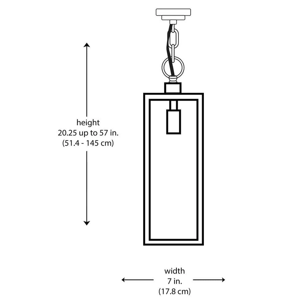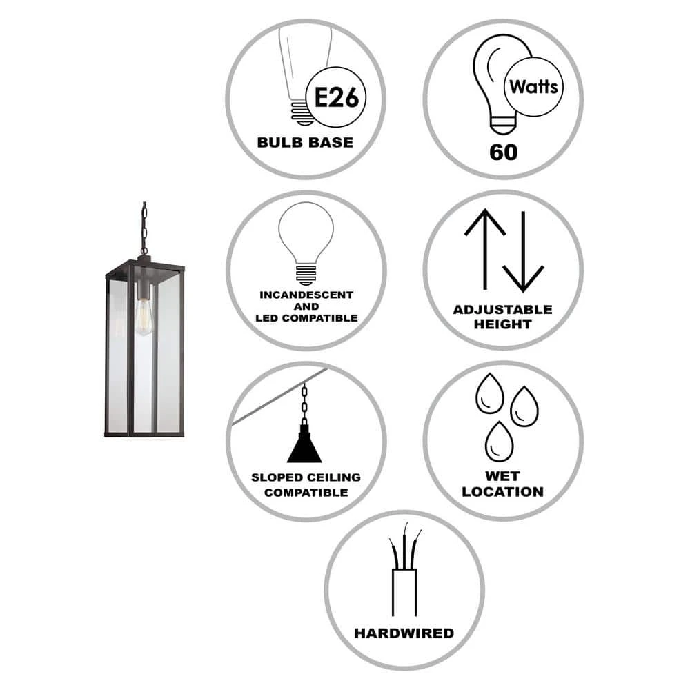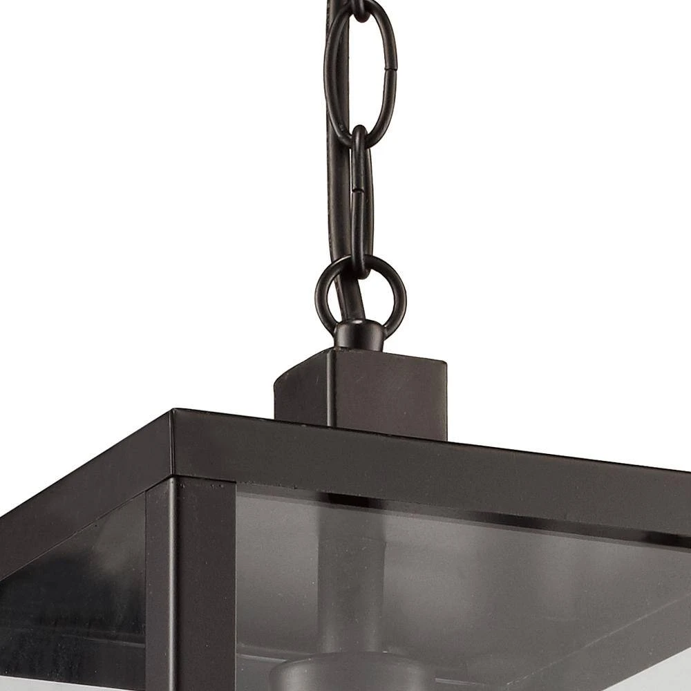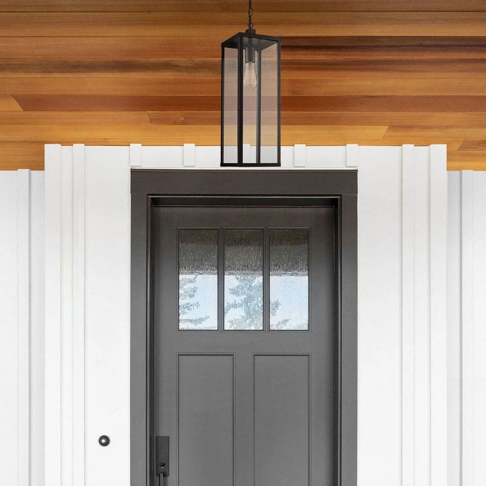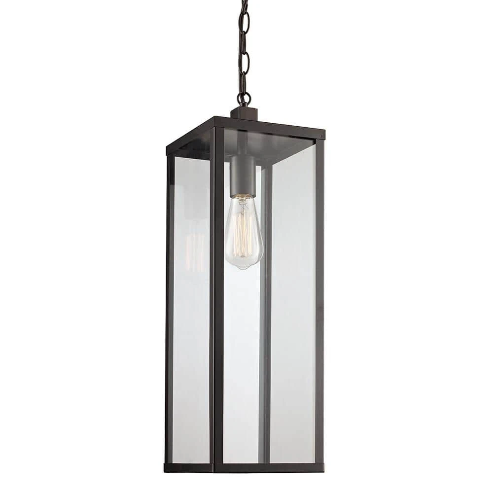 The Oxford collection exhibits modern industrial outdoor lighting designed to coordinate with a variety of home types and decor styles. The Oxford 20.25 inch tall hanging light is the largest outdoor pendant in the collection and features a simple rectangular frame and clear glass sides; design elements that coordinate throughout the family. The pendant brings ambient lighting to overhang areas and porches without occupying any usable space. A single down-light bulb is visible through the clear glass and is easily accessed through the open bottom of the fixture. A vintage, Edison style bulb is recommended (not included) to add an industrial feel to the piece. The linear pendant body hangs from a matching black chain, offering an adjustable height and sloped ceiling compatibility.
