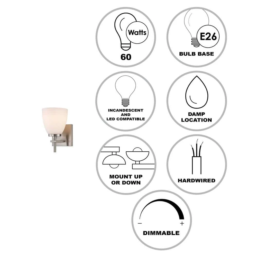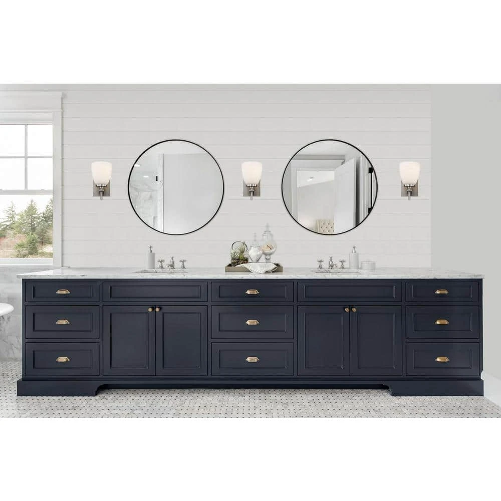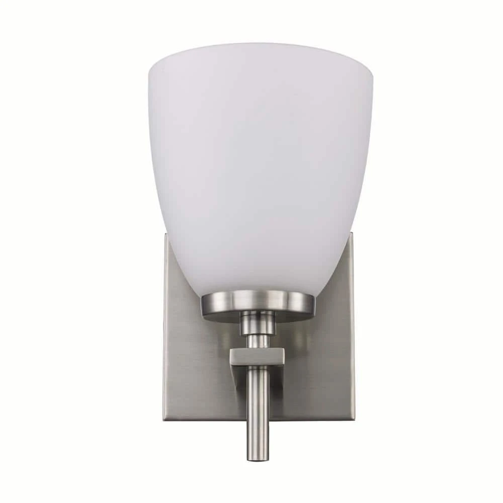 The Oxnard Collection from Bel Air exhibits modern bathroom lighting designed to suit a variety of home decor styles from transitional to contemporary. The Oxnard armed sconce is a decorative wall light that works well in bathrooms and powder rooms. Use as a single unit in smaller spaces or use as a set on either side of a sink or vanity mirror in larger areas. The fixture is constructed of brushed nickel finished metal and includes a square wall plate with a torch-style arm that holds the glass shade in place. The frosted glass shade has a round bell shape, house a single light bulb, and is open at the top for easy access to change the bulb. This wall sconce can be mounted with the shade opening pointed upwards or down for a customized look, and for directional lighting either above or below the fixture. Shop the Oxnard Collection for coordinating vanity light fixtures to complete your bathroom renovation.