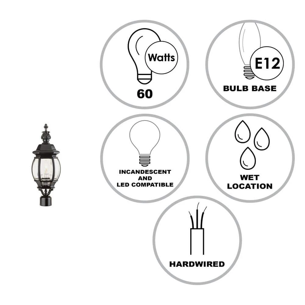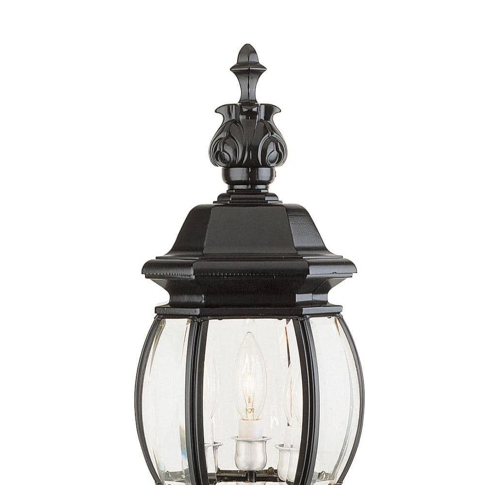 The Parsons Collection from Bel Air exhibits traditional style outdoor lighting designed to coordinate well with a wide variety of home types and decor styles from traditional, to rustic and farmhouse. The Parsons post mount light adds charming character to your homes’ landscape areas while using three candelabra light bulbs to provide illumination in medium and larger sized spaces. The craftsman design is highlighted by the carved roof and feather-leaf accented finial, elements that are unique to the Parsons family. The metal body of the light is finished in black, and clear glass windows surround the eight sided frame allowing for maximum light output. This post light mounts atop standard light poles, or can be mounted on walls and columns using a pier mount base.
