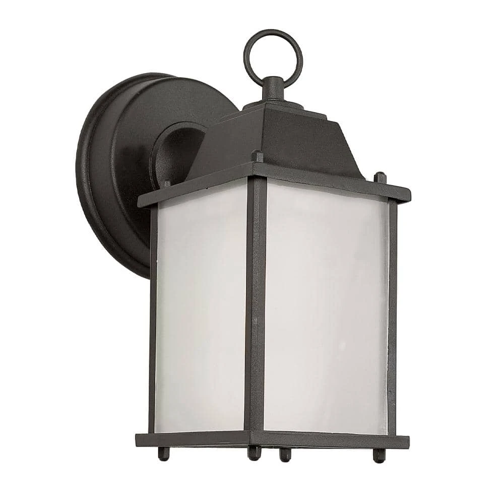 The Patrician Collection from Bel Air offers quaint outdoor lighting designed to blend seamlessly with a variety of home styles from traditional to modern. This Patrician exterior wall light is featured in a sleek black finish, and includes a matching round wall plate and decorative ring on top for added style. A single down light bulb is hidden behind the frosted glass sides, allowing warm and even light to shine out from within. This fixture uses a bi-pin base CFL or LED bulb for energy efficiency. The wall light is open at the bottom to allow easy access to change the bulb. The smaller size and classic square shape of this sconce is ideal for use in porch areas, back patios, and exterior entryways.