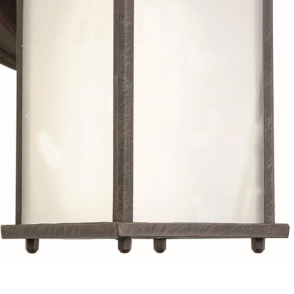 The Patrician Collection from Bel Air offer quaint outdoor lighting designed to blend seamlessly with a variety of home styles from traditional to modern. This Patrician exterior wall light is featured in a warm rust-brown finish, and includes a matching round wall plate and decorative ring on top for added style; design elements that are present throughout the Patrician series. A single down light bulb is hidden behind the frosted glass sides, allowing warm and even light to shine out from within. This fixture uses a bi-pin base CFL or LED bulb for energy efficiency. The piece is open at the bottom to allow easy access to change the bulb. The smaller size and classic square shape of this wall light is ideal for use in porch areas, back patios, and exterior entryways.