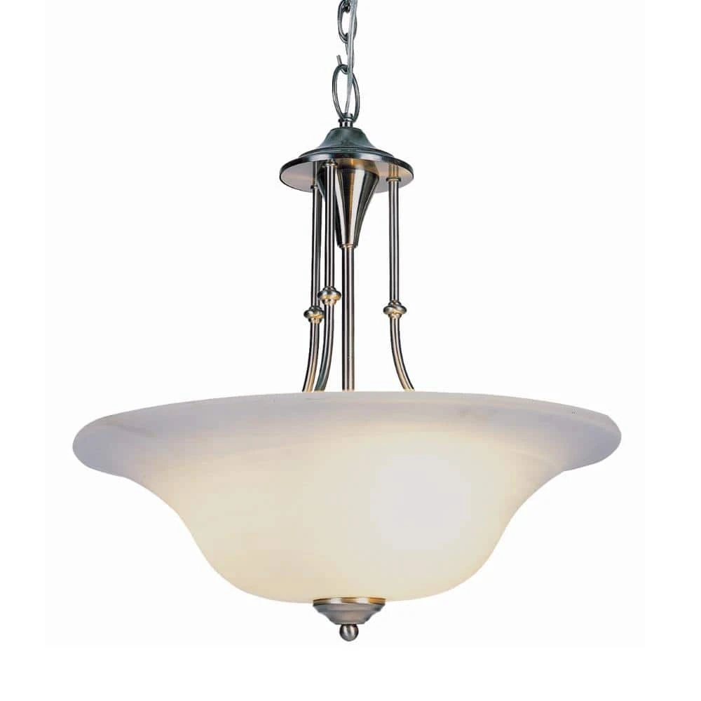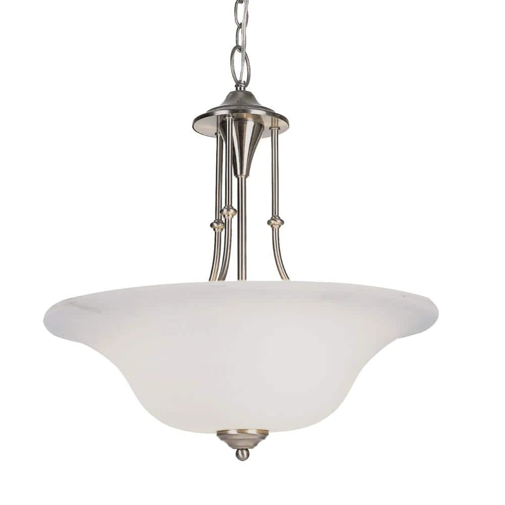 The Perkins Collection from Bel Air combines transitional design themes with functionality for a family of interior lights designed to coordinate seamlessly with your home’s existing decor while providing ample illumination for your daily needs. The Perkins 20-inch round pendant is a decorative hanging light that works well in kitchen areas, dining rooms, foyer entrances, and more. The piece includes a metal frame finished in brushed nickel, a bowl-shaped marbleized glass shade with matching finial at the base, and nickel-finished hanging hardware. The opaque glass houses three light bulbs and is open at the top for easy access to change the bulbs, as well as to allow light to flood out over top for ample illumination. The glass is held in place by three decorative curved arms, and the pendant body hangs from a chain that offers height adjustability and sloped ceiling compatibility. Shop the Perkins Collection for additional finishes options and additional interior lighting pieces to coordinate throughout your home.