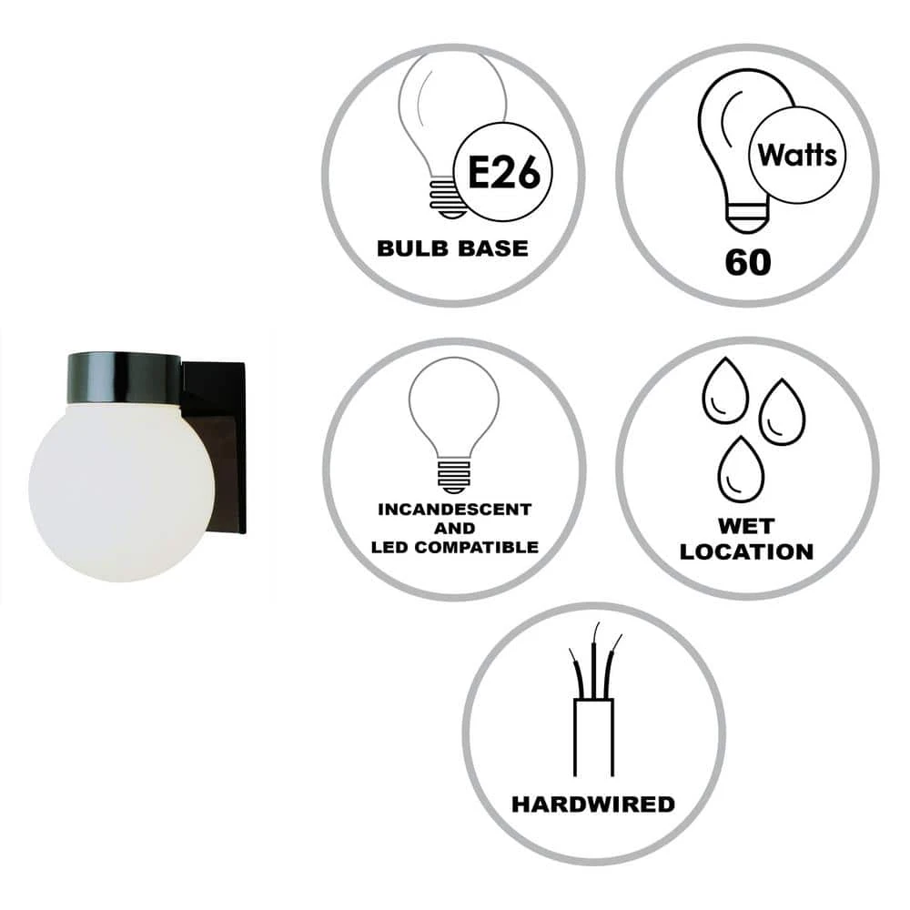 The Pershing Collection offers functional outdoor wall lighting with retro, mid-century modern appeal. The Pershing single light wall sconce features a classic black finish contrasted with an opal white glass shade in the shape of a globe. The globe shade twists and locks into the metal housing, ensuring a secure fit to hold up in harsh weather conditions. A 60-watt bulb is housed inside the glass, and an LED bulb can be used for energy efficiency (sold separately). Pershing’s minimalist style and classic finish choices lends well to nearly any style home, from traditional to modern. Mount this exterior wall light in porch entryways, along walkways, or on either side of a garage door to illuminate your homes driveway at night.