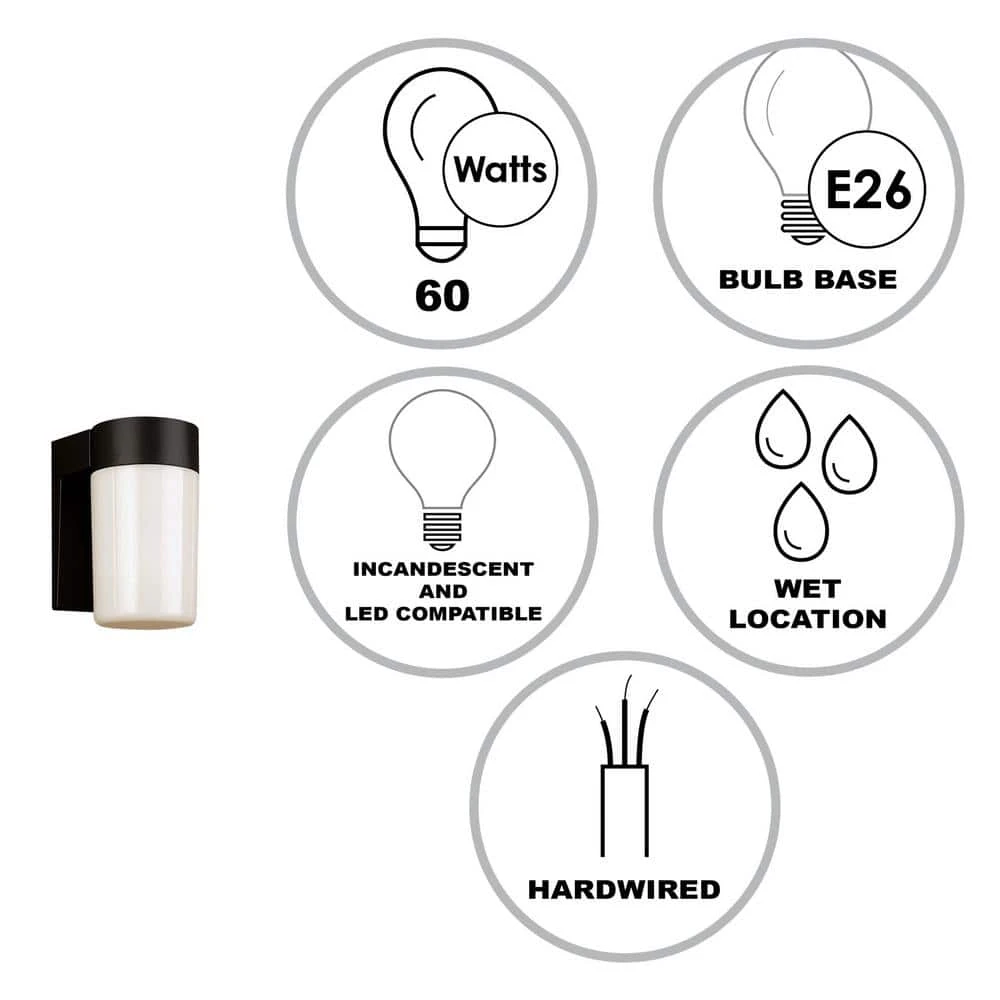 The Pershing Collection offers functional outdoor wall lighting with retro, mid-century modern appeal. The Pershing single light wall sconce features a classic black finish contrasted with an opal white glass shade in the shape of a “jelly” jar. The globe shade twists and locks into the metal housing, ensuring a secure fit to hold up in harsh weather conditions. A 60-watt bulb is housed inside the glass, and an LED bulb can be used for energy efficiency (sold separately). Pershing’s minimalist style and classic finish choices lends well to nearly any style home, from traditional to modern. Mount this exterior wall light in porch entryways, along walkways, or on either side of a garage door to illuminate your homes driveway at night.