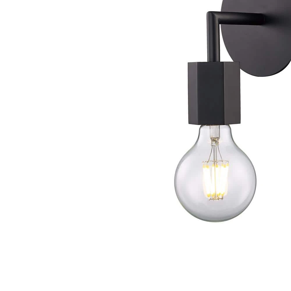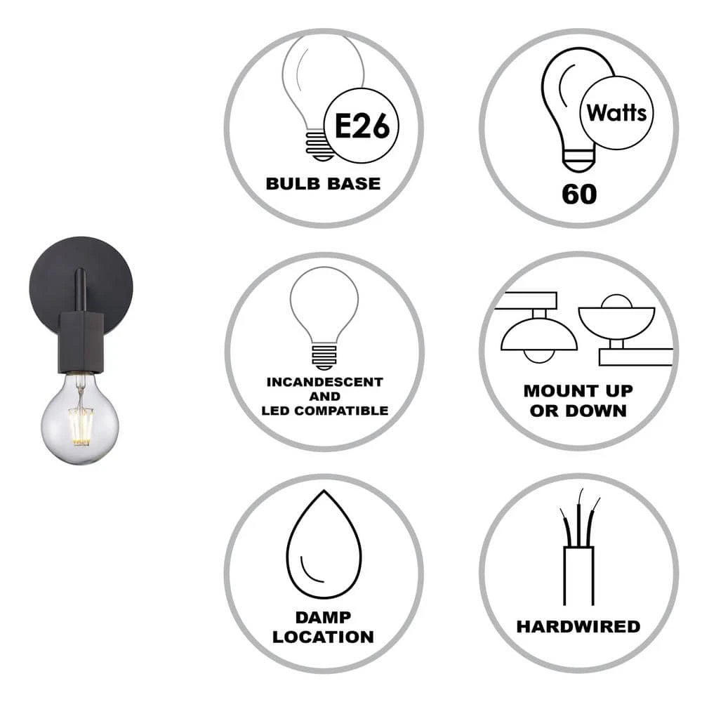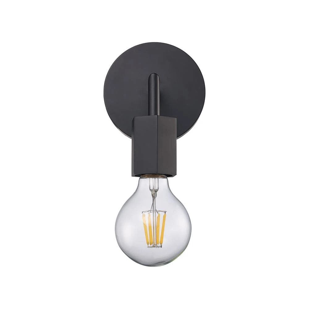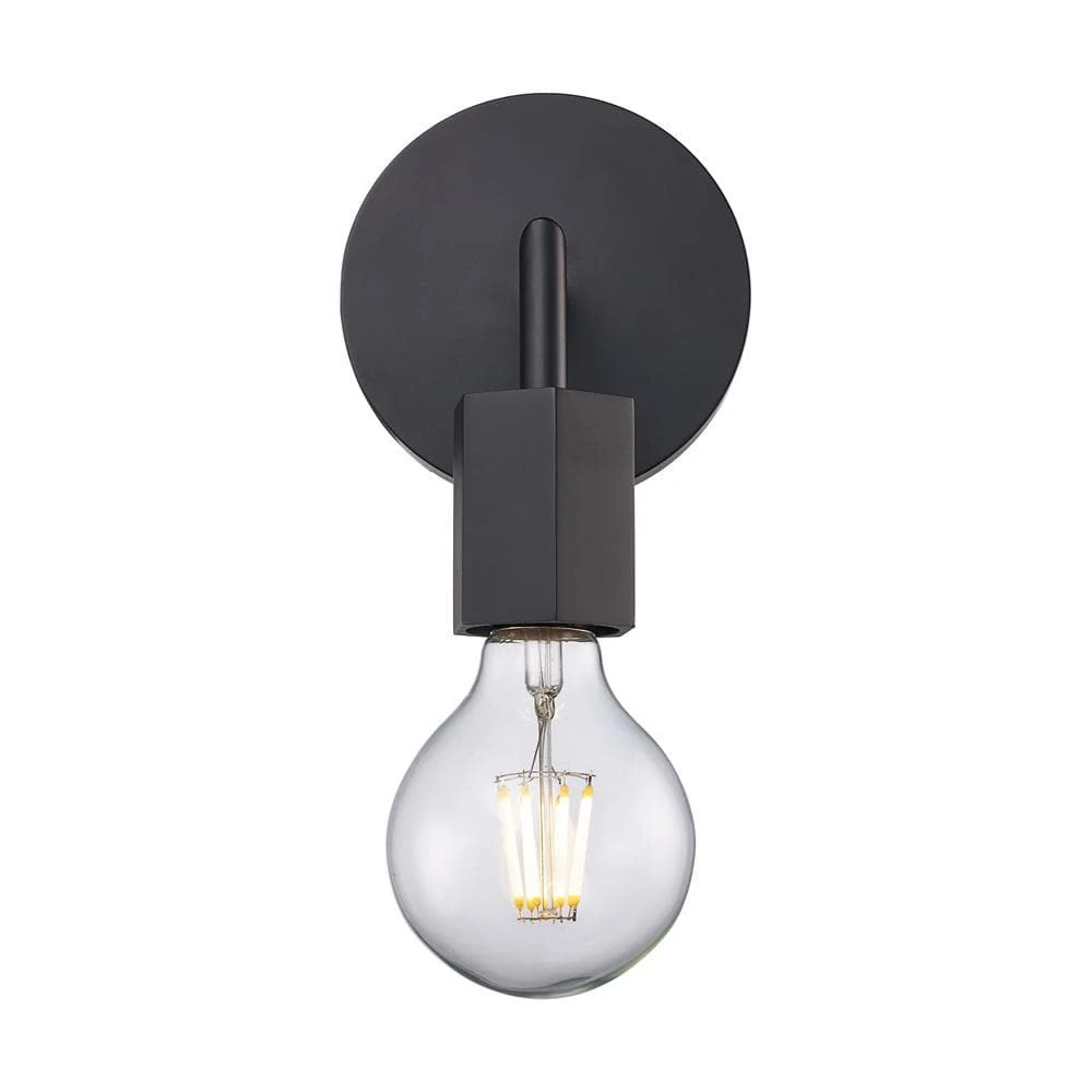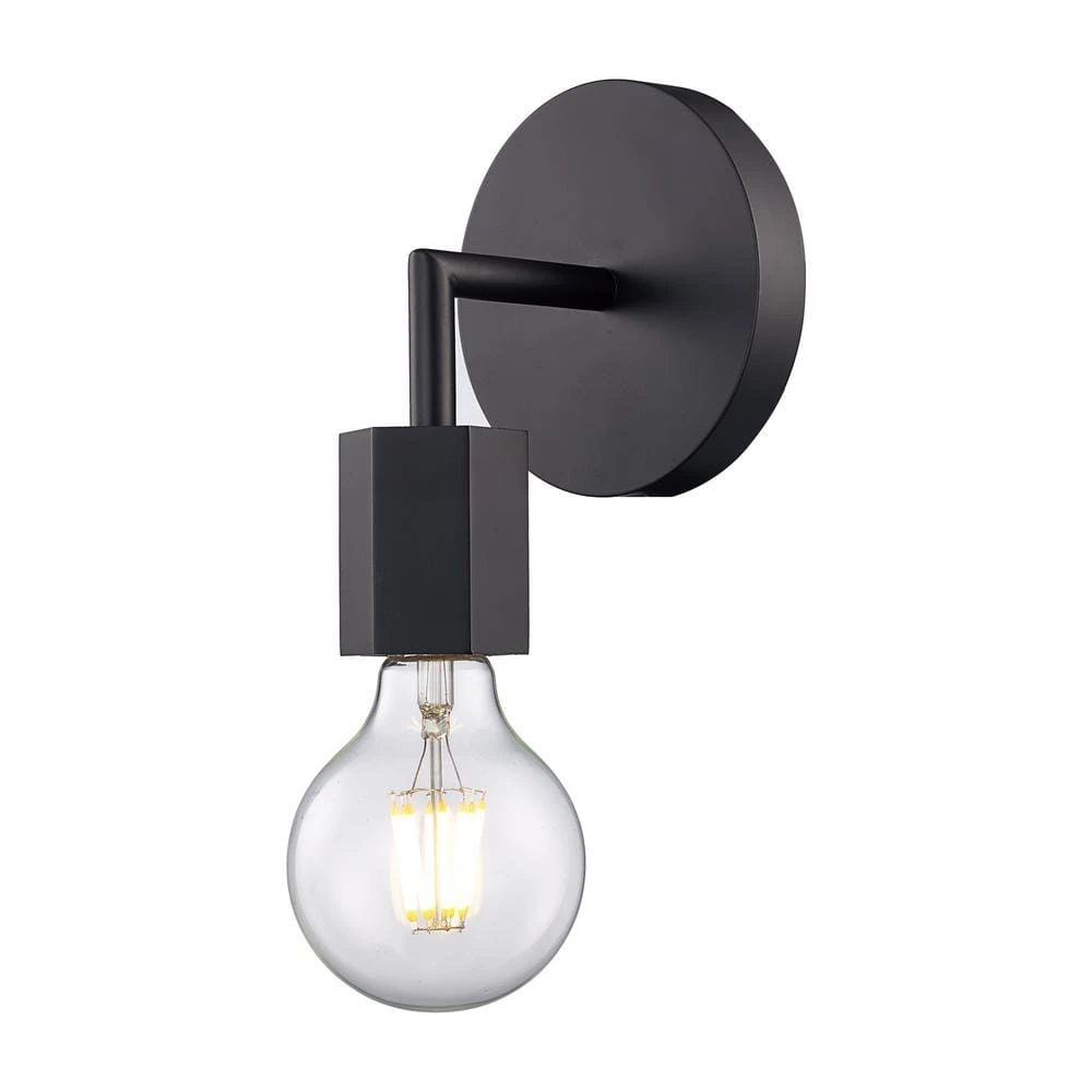 The industrial vanity light collection from Bel Air Lighting exhibits timeless wall pieces with vintage appeal, suitable for use in a variety of bathroom and powder rooms decor styles from modern to transitional. Each piece in the collection features a shadeless design, allowing the light from the bulbs to shine brightly and without shadows. The single light wall sconce comes in a black finish and measures 4.75 inches wide. The overall design of the piece is clean and classic, with a bit of a minimalist edge. The wall sconce can be mounted with the bulb facing upwards or downwards for a customizable look. This fixture looks great on its own, or when mounted in a pair on either side of a vanity sink or mirror.