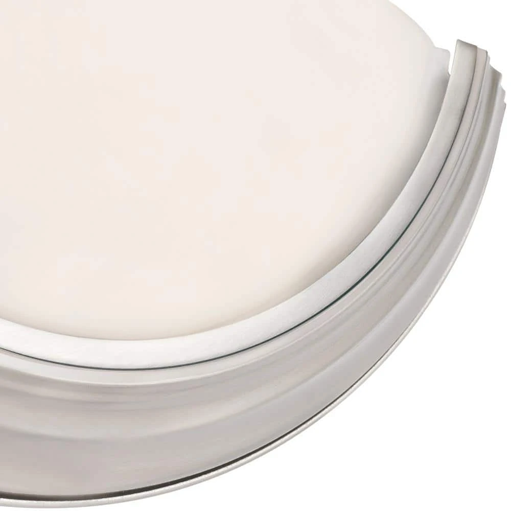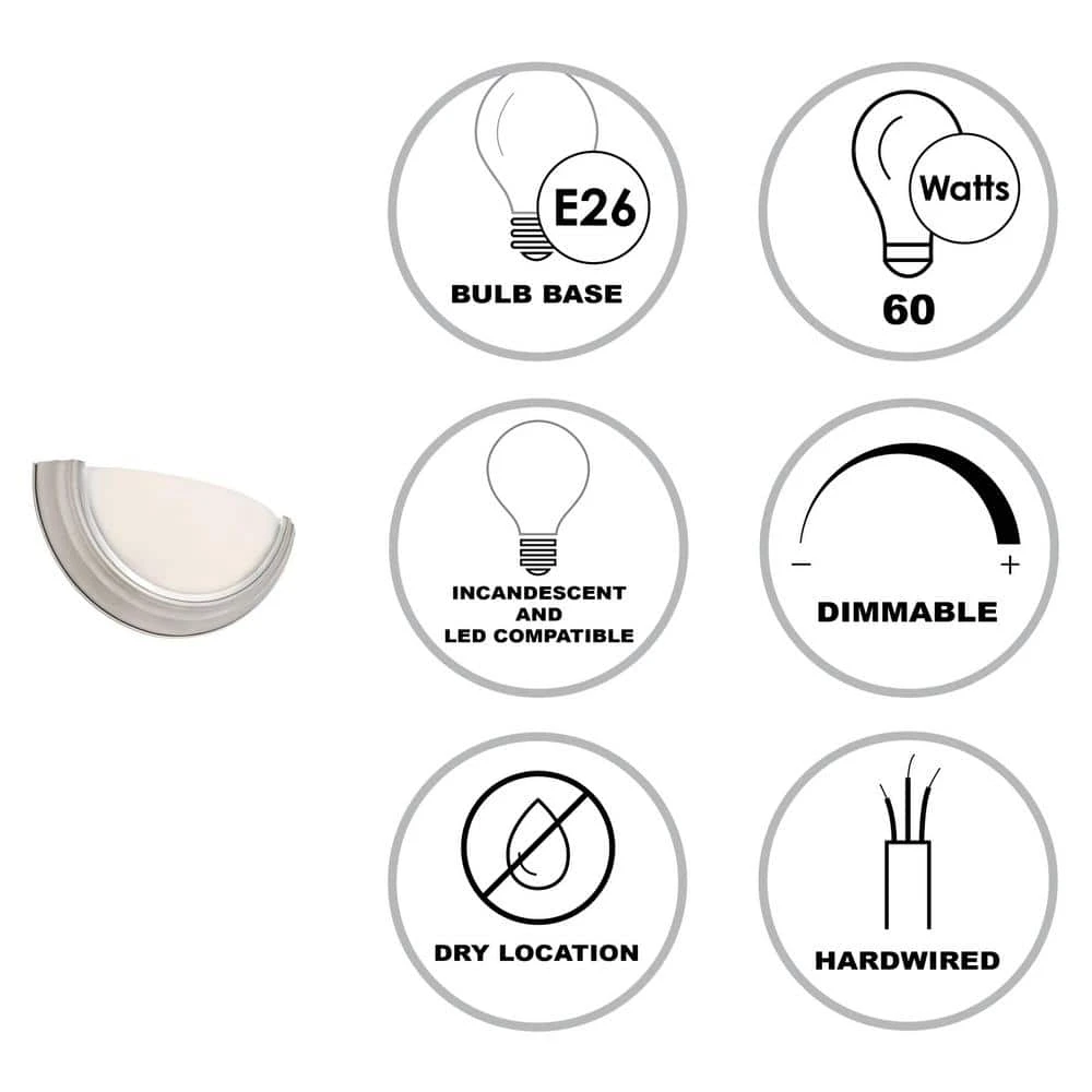 The Ray Collection from Bel Air presents a unique wall sconce that is perfect for adding supplemental lighting to any interior wall space. The transitional tone allows the wall sconce to stand out as both functional and decorative as it lights up hallways, bedrooms, powder rooms, and more. The small scale and understated design allows the piece to coordinate with any interior decor style from traditional to modern. The 12.25 inch wide half-moon fixture sits flush to the wall, is trimmed in metal, and includes a white frosted glass shade. A single 60-watt light bulb is housed in the fixture, and an LED bulb can be used for energy efficiency.