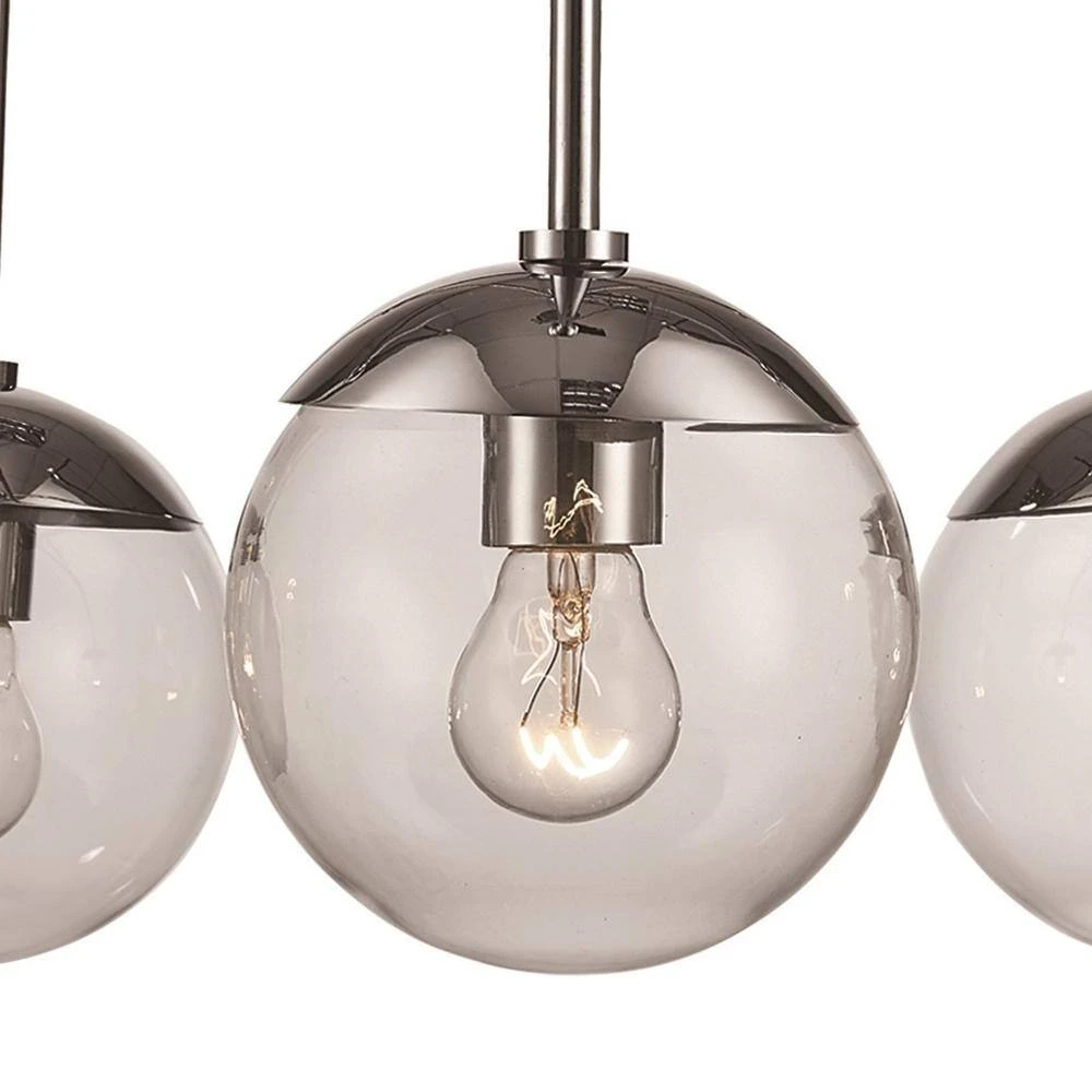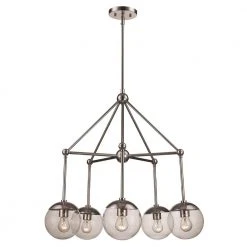 The Riviera Collection from Bel Air features midcentury modern interior lighting, deigned to offer functional lighting and an eye-catching style to your home’s entryways, kitchen areas, and dining rooms. The Riviera 26-inch round chandelier is the smallest hanging light in the collection, offering a 5-light design. Each light socket is surrounded by a globe shade inspired by midcentury design themes. The glass globes are topped with metal caps and hang evenly spaced around a central support wheel. The chandelier body hangs from extension rods that allow for an adjustable height. The refined vintage look is highlighted by the metallic polished chrome finish present throughout the piece. Hang this chandelier above a kitchen island or dining room table for decorative illumination. Also available in a larger 8-light model for larger indoor spaces.