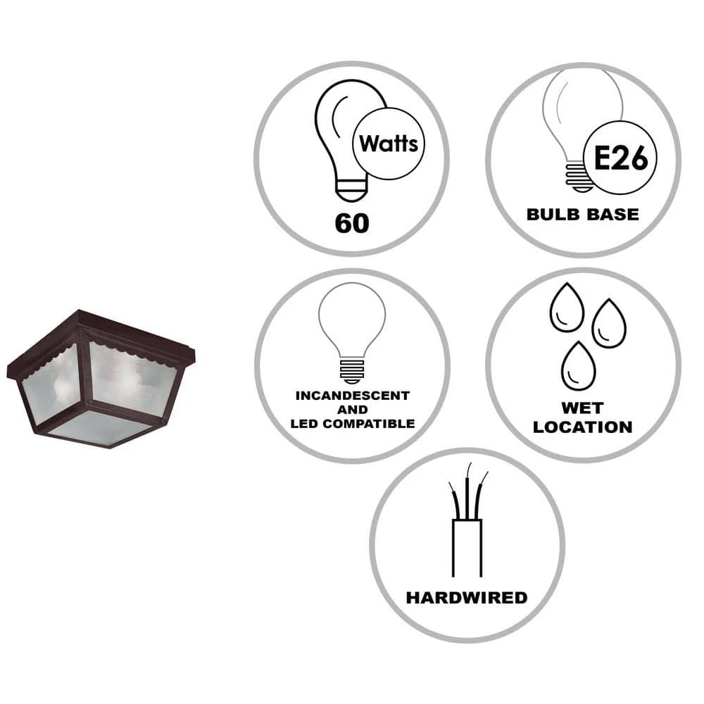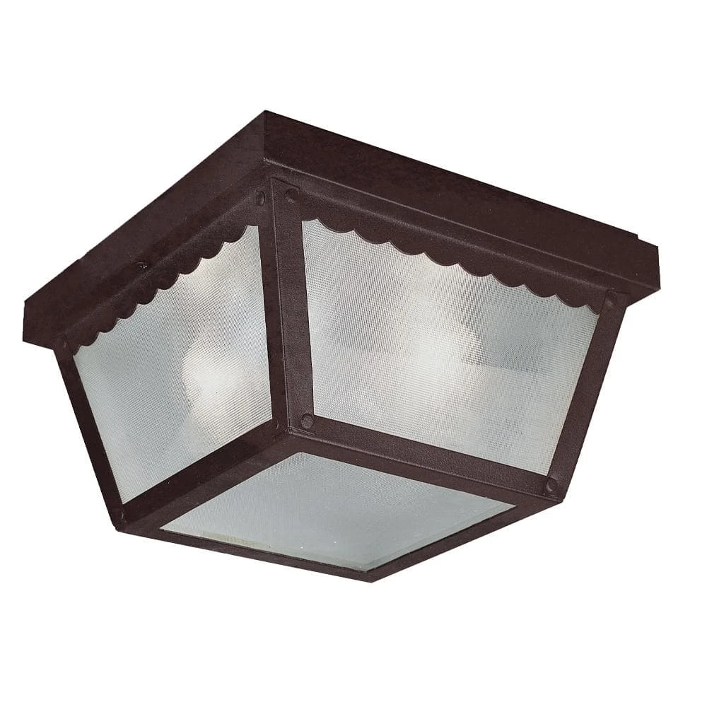 The Samantha Collection of outdoor lights offers low-profile, transitional style flush mount lighting suitable for a wide range of home types and exterior applications. The Samantha two-light ceiling fixture is the largest in the collection, measuring 9.5 inches square and offering an ample amount of illumination. The decorative scalloped trim and frosted glass hobnail textured glass sides add a unique appeal to the piece. The rust finish is weather resistant, and will coordinate seamlessly with your existing outdoor lights and decor. This outdoor flush mount is ideal for use in porch entryways, garages, backyard patio spaces, and more.