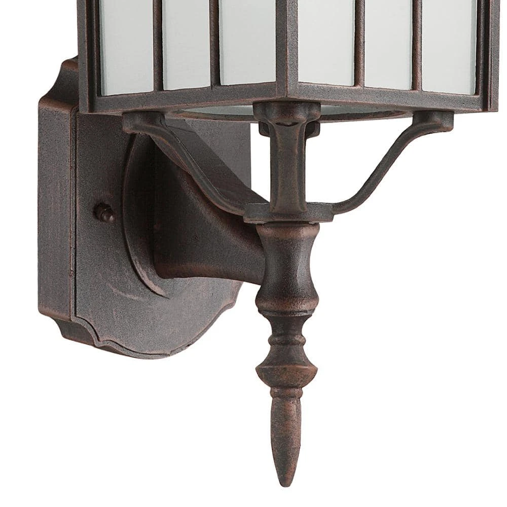 The San Gabriel Collection from Bel Air presents craftsman style outdoor lights with an updated mission appeal, combining a unique look with functionality. The San Gabriel 18.5 inch tall wall sconce draws on the nostalgic charm of suspended coach lantern lighting with a four sided, square body and decorative curved roof. The piece is finished in a warm rust-brown and features nine frosted glass panes on each of the sides. A single 60-watt light is diffused behind the glass, creating a lovely warm illumination in any outdoor environment. The fixture attaches to the wall with a sturdy arm detail and matching shaped backplate. Mount as a single unit to illuminate walkways, or as a set on either side of an exterior entryway, garage door, or hallway. Shop the San Gabriel Collection for additional finishes and fixture styles.