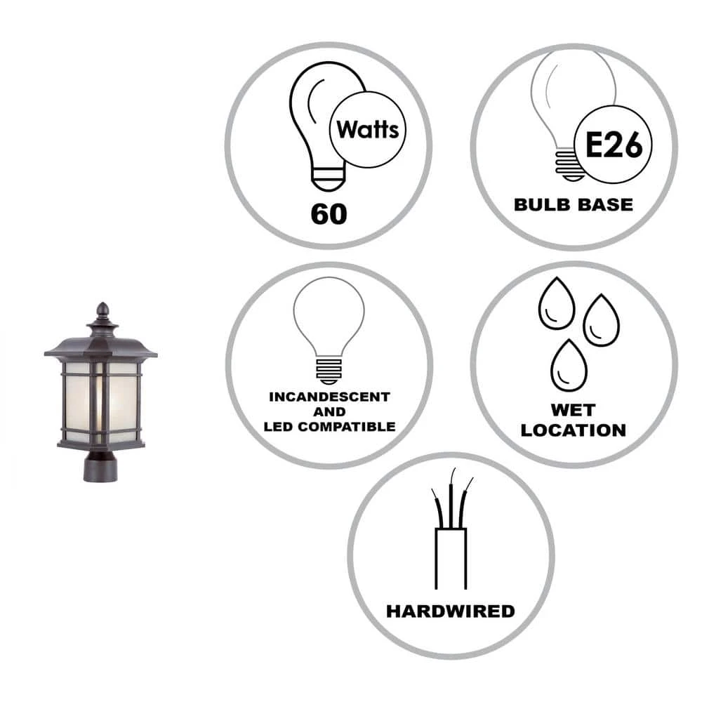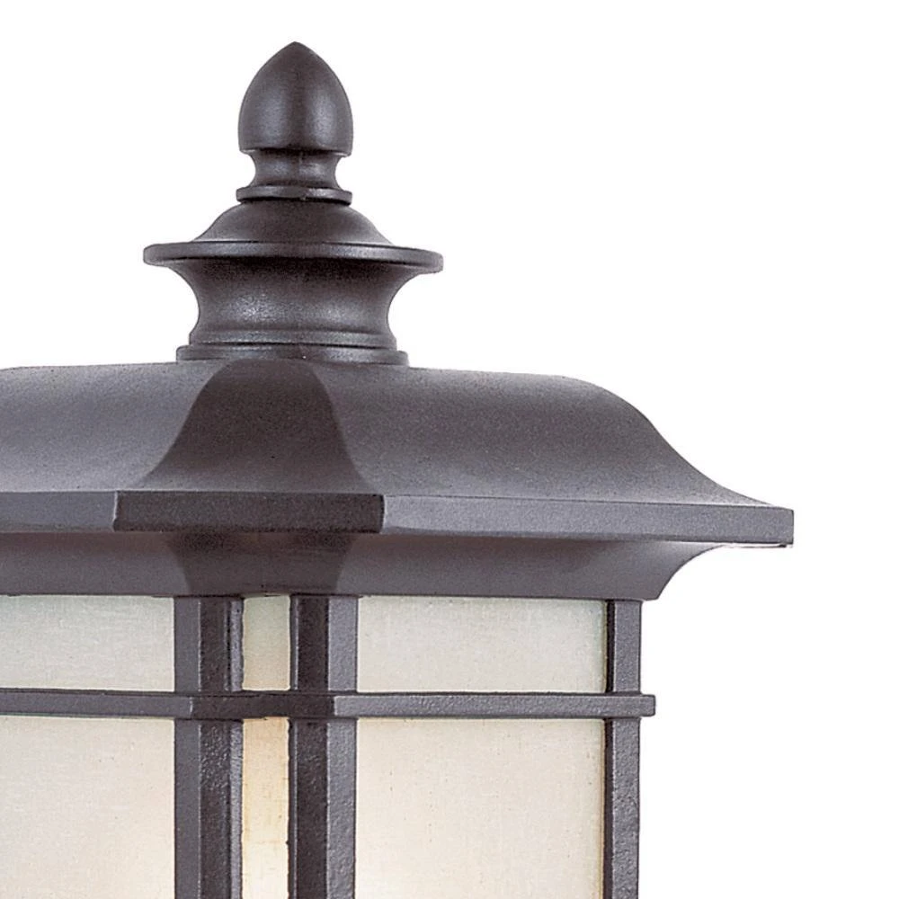The San Miguel Collection from Bel Air exhibits unique outdoor lighting that blends features from Japanese gardens, Spanish missions, and craftsman designs. The San Miguel 17 inch tall post mount lantern features a black finish, metal frame, and tea stained linen-pattered glass on all four sides. A warm glow emits from the single light bulb inside, providing accent and area lighting in landscaped areas. This lantern can be mounted atop light poles, as well as columns and walls when using a pier base adapter. Use to illumination outdoor walkways, steps, entertaining areas, and more.