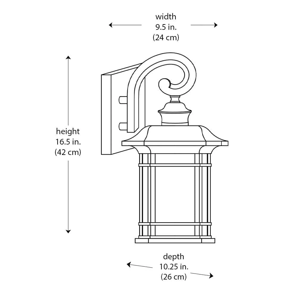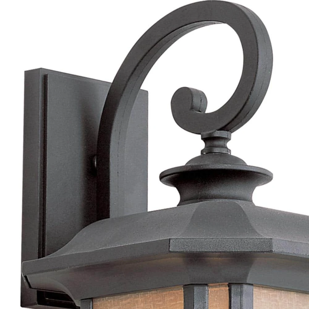 The San Miguel Collection from Bel Air exhibits unique outdoor lighting that blends features from Japanese gardens, Spanish missions, and craftsman designs. The San Miguel 16.5 inch tall outdoor wall light features a black finish, metal frame, and a scroll arm detail that extends from a rectangular back plate to suspend and hold the lantern in place. Tea stained texture glass windows on all four sides allow a warm glowing light to emit from the single bulb inside. The piece is open at the bottom to allow easy access to the bulb, and to allow for directional lighting below. The medium size is ideal for porches, walkways, and driveways.