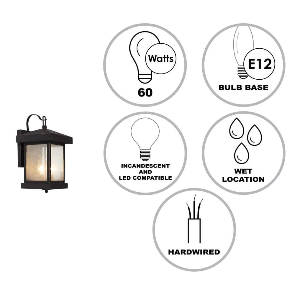 The Santa Cruz Collection from Bel Air exhibits rustic styled exterior lights with rich, weathered bronze finishes and decorative seeded glass sides. Each piece in the Santa Cruz Collection is wet rated, and suitable for use in any outdoor covered or uncovered location. The two-light wall sconce is the medium sized piece in the collection, offering abundant light for both small and large sized spaces. The lantern style body appears to “hang” from a decorative metal scroll arm, a craftsman detail present throughout the collection, while remaining firmly affixed to the matching weathered bronze wall plate to hold up in harsh weather conditions. Mount this wall lantern on either side of a garage to light your home’s driveway, along an exterior walkway, or near entrances to provide a warm and inviting illumination.
