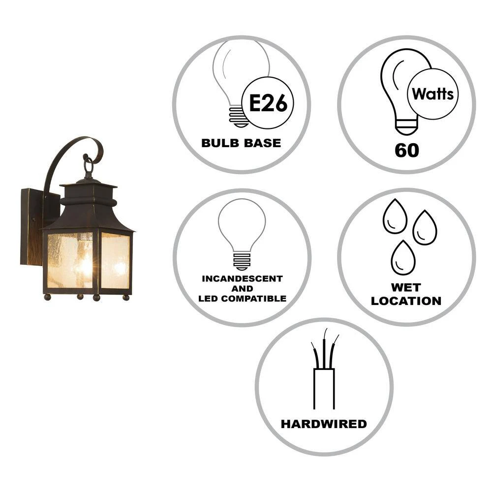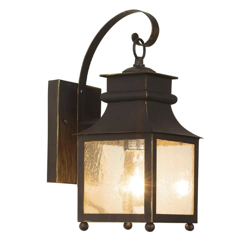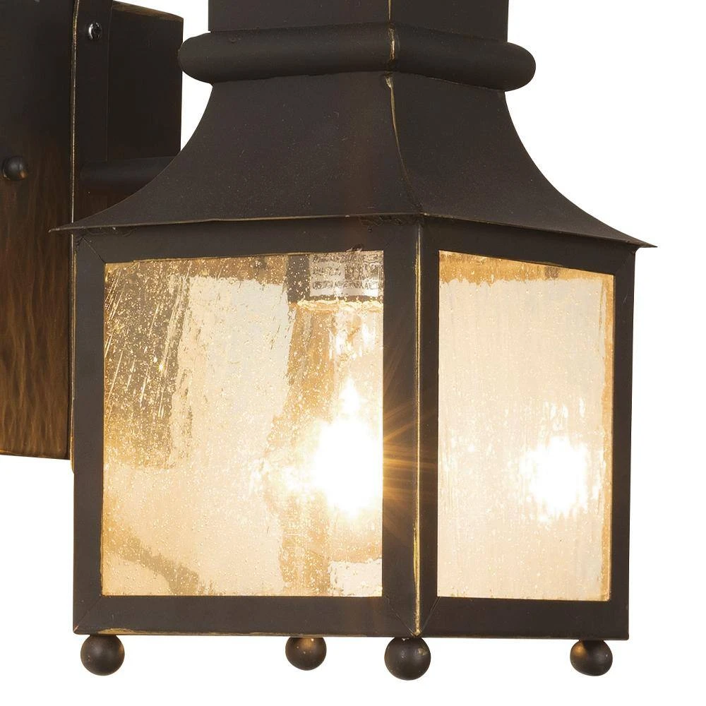 A fashionable weather bronze finish combines flawlessly with clear seeded glass, making this Santa Ines Collection outdoor wall light both sleek and functional. The Santa Ines 6 inch wide outdoor wall light is the smallest in the collection, offering a compact solution for your home’s exterior lighting needs. A single 60-watt hanging bulb is visible inside the seeded glass shade, allowing for ample illumination in porch areas, walkways, and driveways. The lantern hangs from a decorative scroll arm, and is firmly attached to the wall plate by a metal rod to hold up in harsh weather conditions. The rustic styling and dark finish lends itself to coordinate well with a variety of home styles, from traditional to modern.