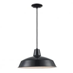 The Sherman Collection exhibits industrial style lighting suitable for a variety of interior decor styles ranging from farmhouse to modern. The Sherman 15.5 inch round pendant features a metal dome shade in a classic black finish with a reflective lining on the interior to enhance the light output. A single down-light bulb is housed in the shade and shines brightly through the open bottom for directional illumination. This barn-light style pendant body hangs from a round ceiling canopy and a matching black wire, offering an adjustable height and sloped ceiling compatibility. This fixture looks great as a single piece in a living room or home office, or when hung in multiples along a large kitchen island or dining room table.