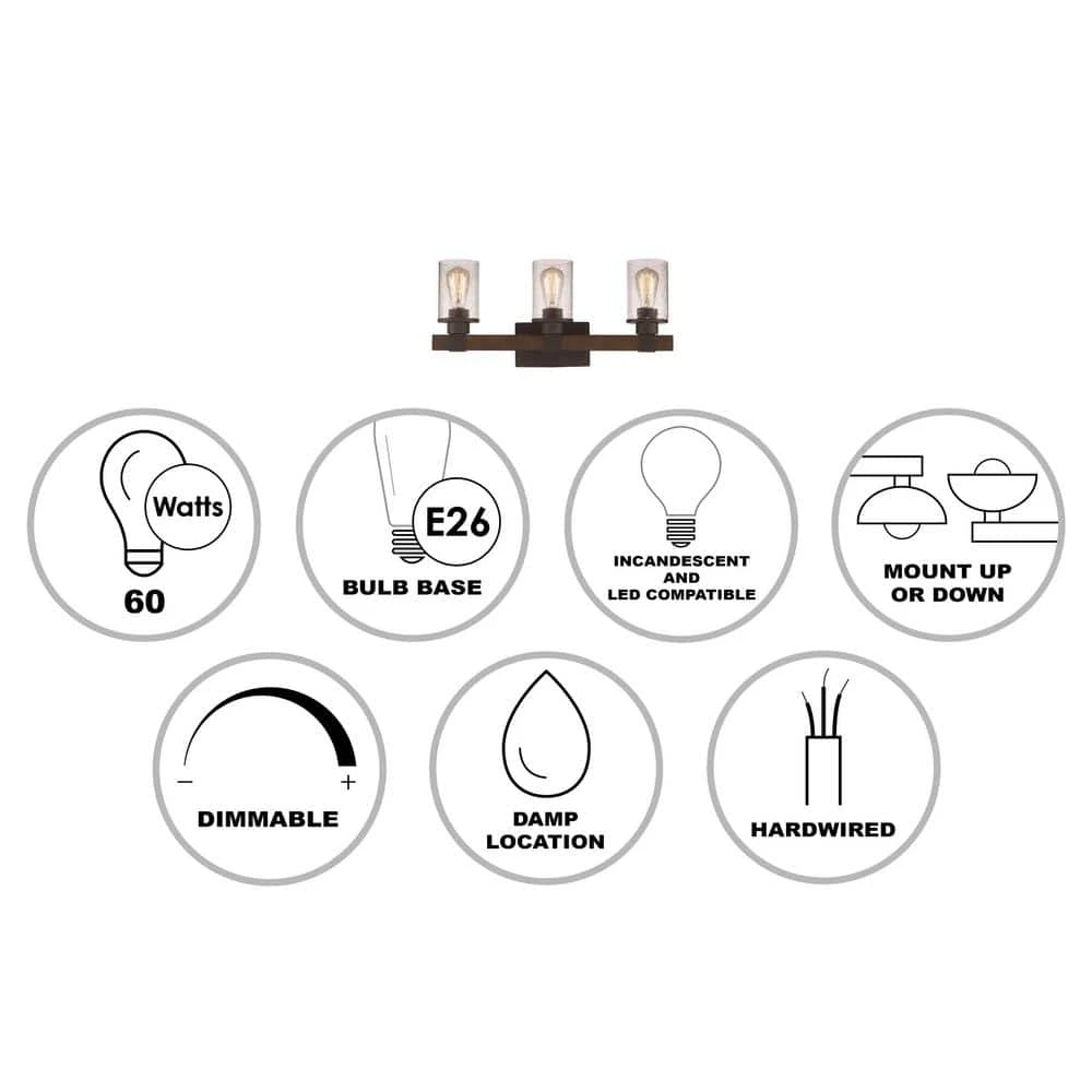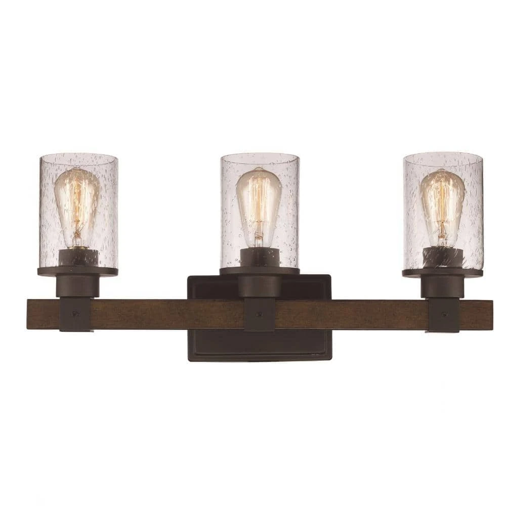 The Siesta Collection from Bel Air exhibits rustic vanity lighting designed to bring functional illumination into your home’s bathroom and powder room spaces while adding a layer of unique style to your interior decor. The Siesta 22.75 inch vanity bar is finished in rubbed oil bronze and features faux wood accents throughout. The marriage of warm metalwork and wood detailing is reminiscent of farmhouse design, and works well in modern farmhouse and industrial styled interiors. Three cylindrical seeded glass shades sit atop the faux wood support beam, allowing the light from the bulbs (not included) to shine brightly out. Edison style filament bulbs are recommended to capitalize on the rustic tone of the piece. Each fixture in the Siesta Collection mounts to a matching bronze rectangular wall plate, allowing a seamless mount with no visible wires or bulky hardware. Install this vanity light with shades pointing upwards or down for a customized look.