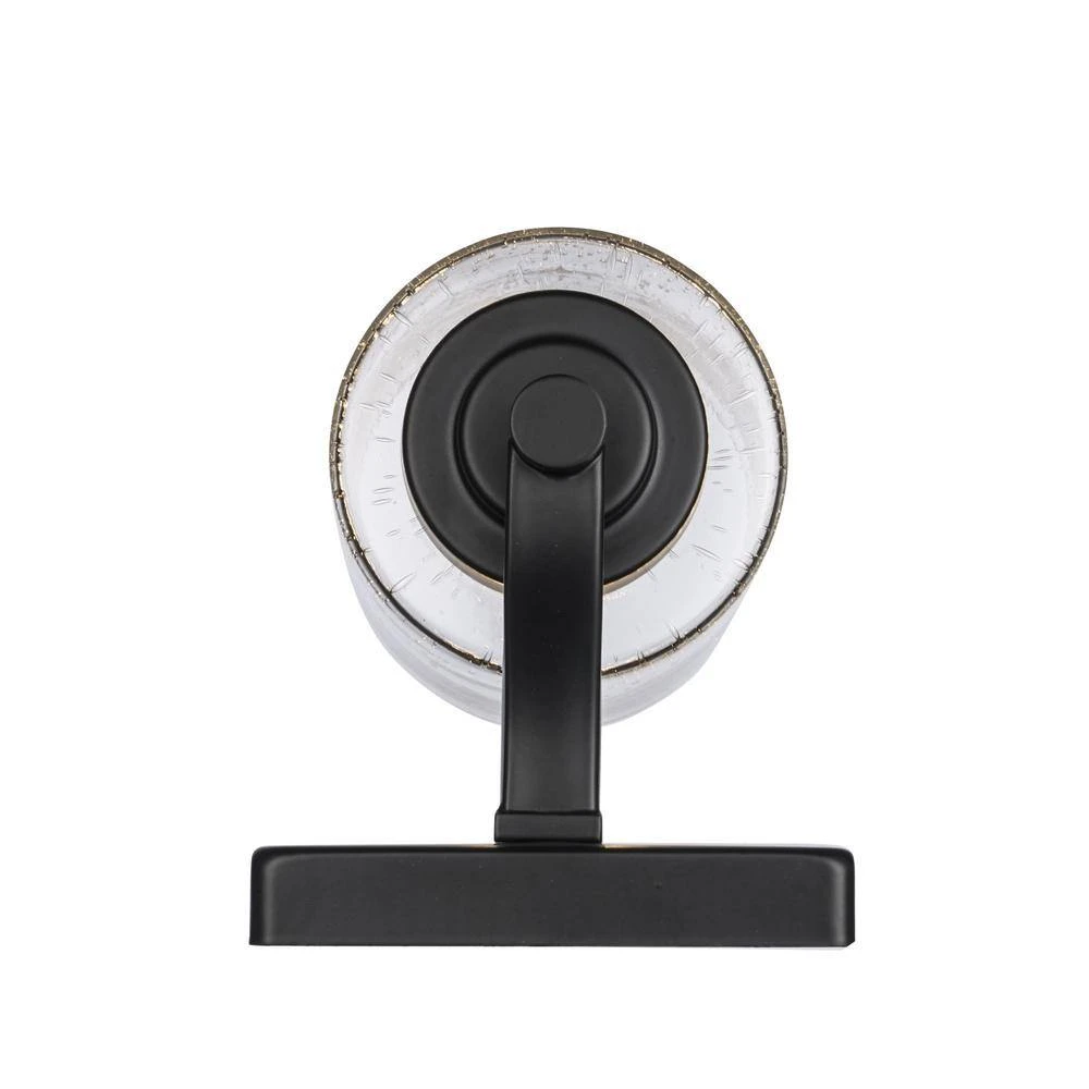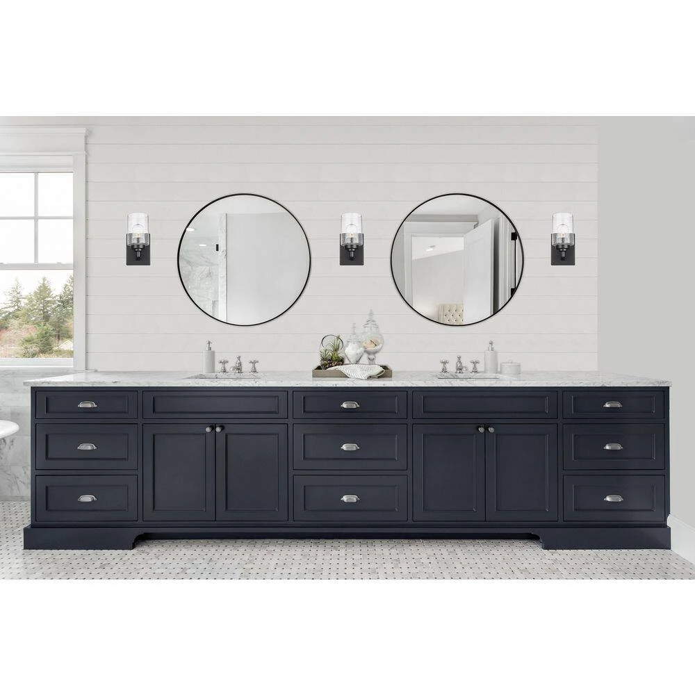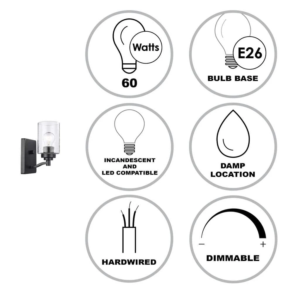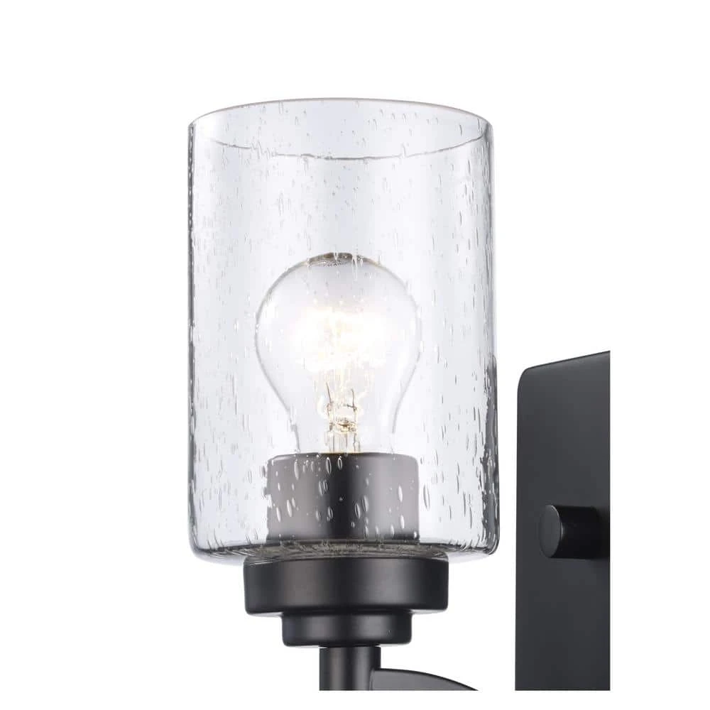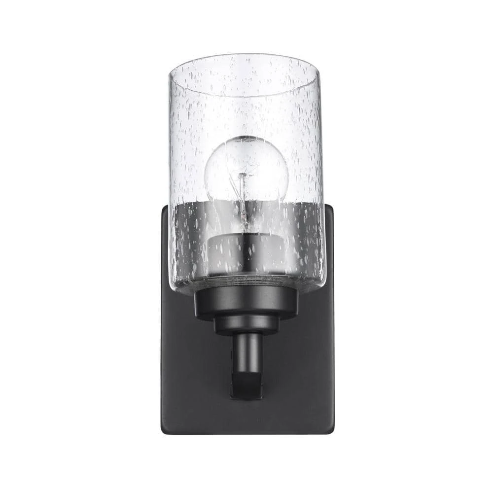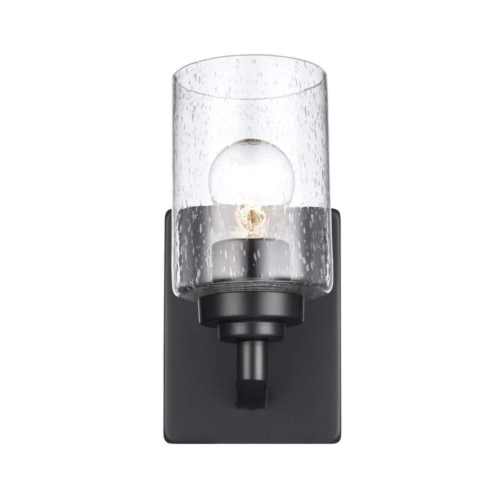 The Simi Collection from Bel Air exhibits modern bathroom lighting designed to suit a variety of home decor styles from transitional to contemporary. The Simi armed sconce is a decorative wall light that works well as a bathroom light fixture, powder room fixture or hallway light. Use as a single unit in smaller spaces or use as a set on either side of a sink or vanity mirror in larger areas. The fixture is constructed of black-finished metal and includes a rectangular shaped wall plate with a delicately curved support structure that holds the glass shade in place. The clear seeded bubble glass shade is cylinder shaped, house a single light bulb and is open at the top for easy access to change the bulb. Install facing upwards or down. Shop the Simi Collection for coordinating vanity light fixtures to complete your bathroom renovation.