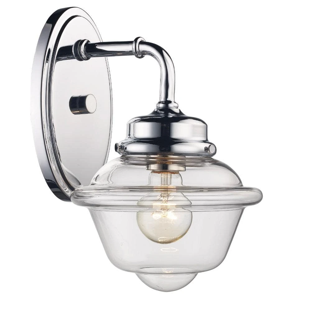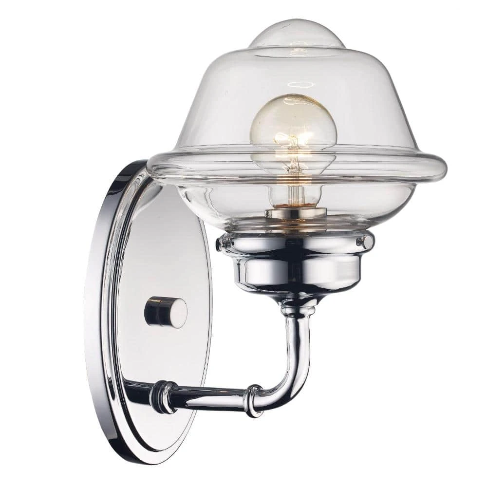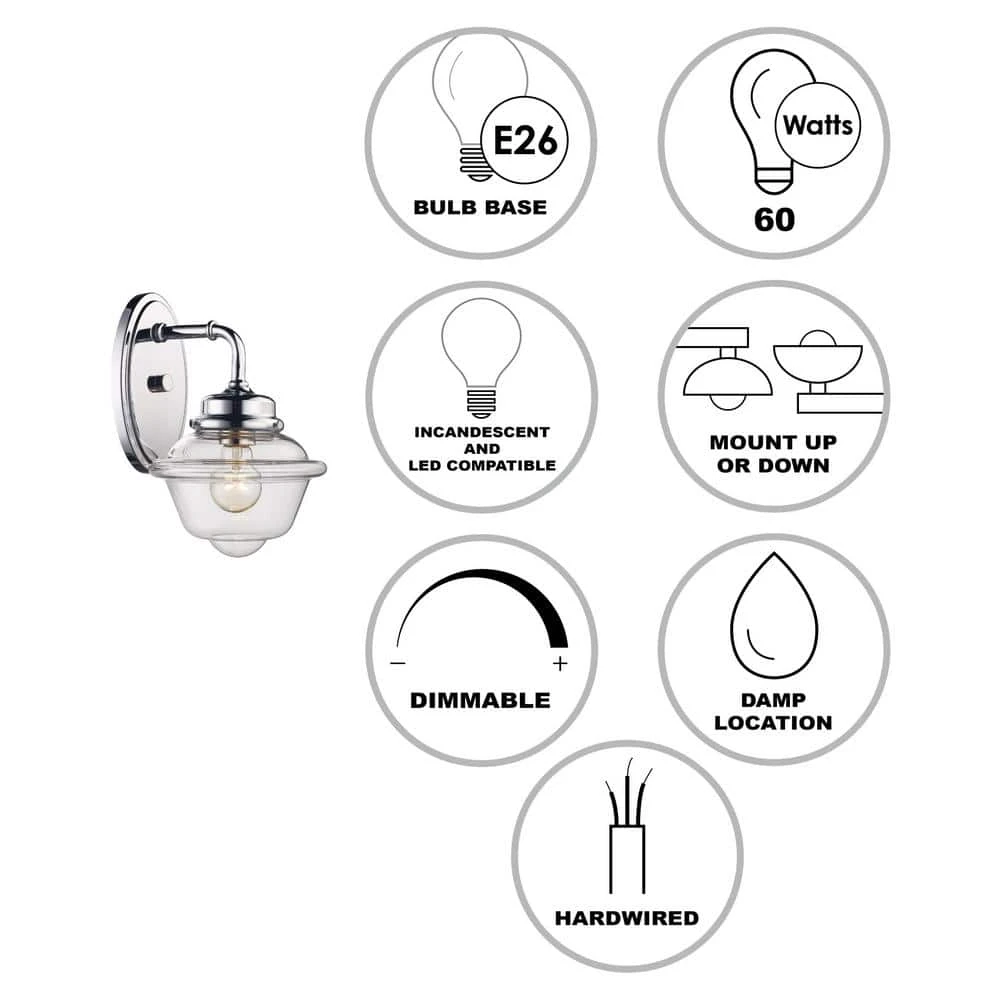 The Smith Collection from Bel Air offers industrial style wall lighting, ideal for use in rustic and farmhouse styled homes. The Smith single light wall sconce is finished in polished chrome to coordinate with existing bathroom and powder room hardware when used as a vanity sconce. A schoolhouse style clear glass shade is included, reminiscent of vintage design. The shade houses a single 60-watt light bulb that shines out brightly from the clear glass, and an LED bulb can be used for energy efficiency. The shade attaches to a simple curved support arm designed to look like warehouse piping, and mounts to a matching oval black plate. This fixture is easy to install and offers a simple way to upgrade your home’s interior. Mount in a bathroom on either side of a vanity mirror, or use as supplemental area lighting in a hallway or entrance.