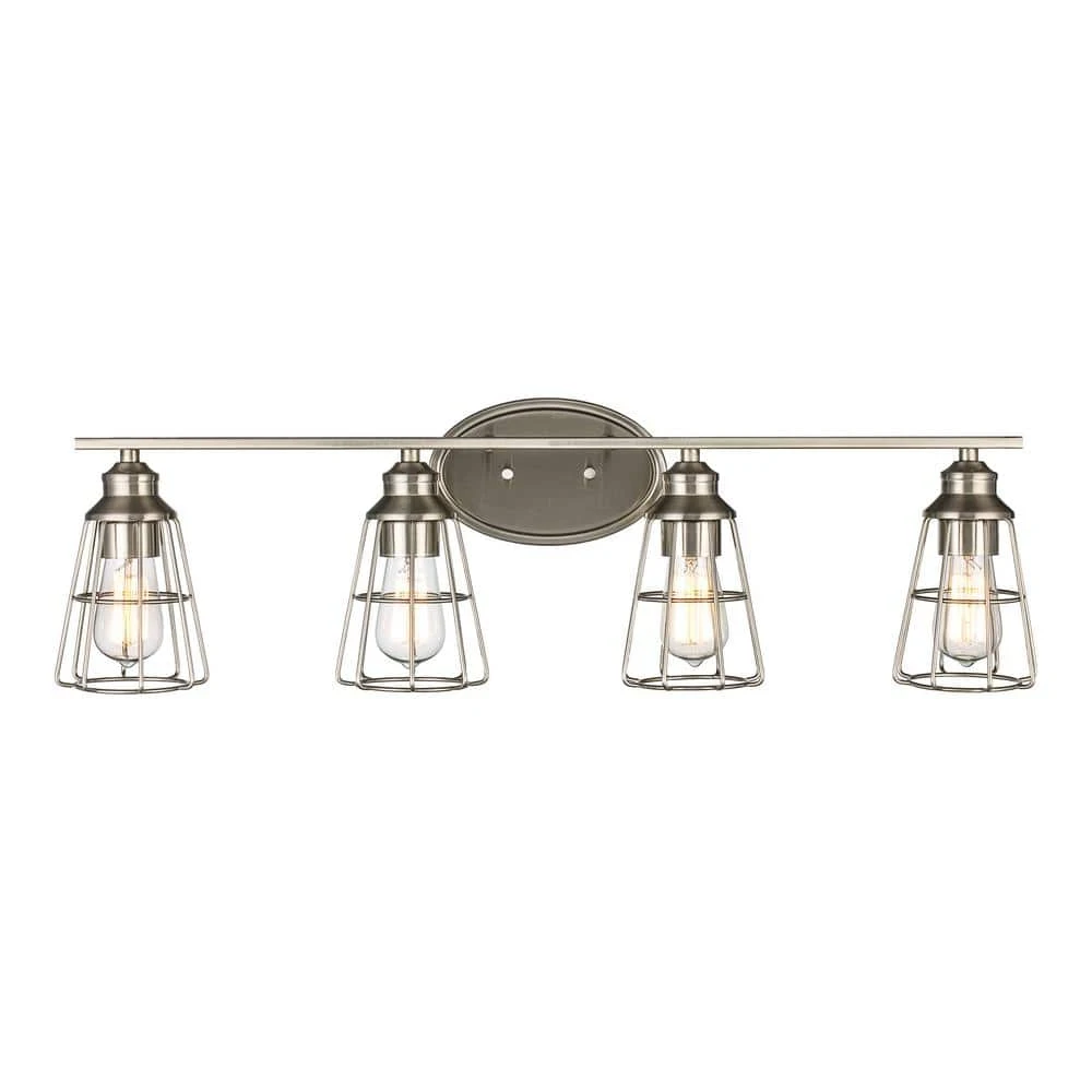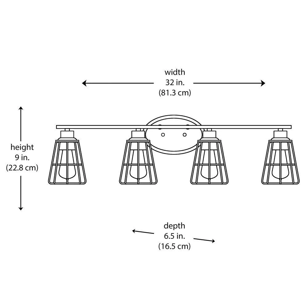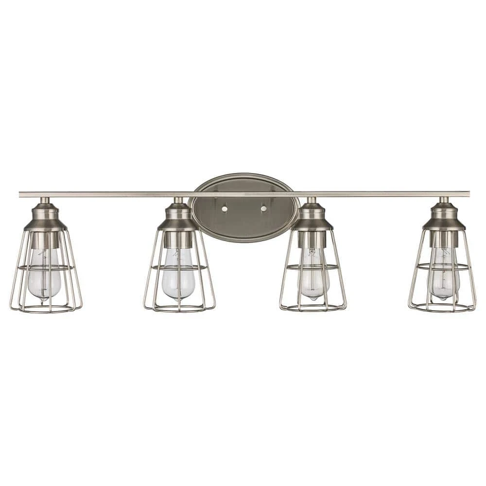 The Solution Collection exhibits industrial style vanity lighting, suitable for a variety of bathroom and powder room applications. Each piece in the series includes cone-shaped metal cage shades attached to a linear support arm and matching oval backplate. The Solution 32 inch vanity bar is finished in brushed nickel, designed to coordinate seamlessly with existing bathroom hardware. The four light design offers ample task lighting, and is suitable for medium to large sized vanities. Vintage, Edison style bulbs are recommended to capitalize on the industrial tone of the piece, not included. This vanity light can be mounted with the shades pointing upwards or downwards for a directional illumination and a customized look.