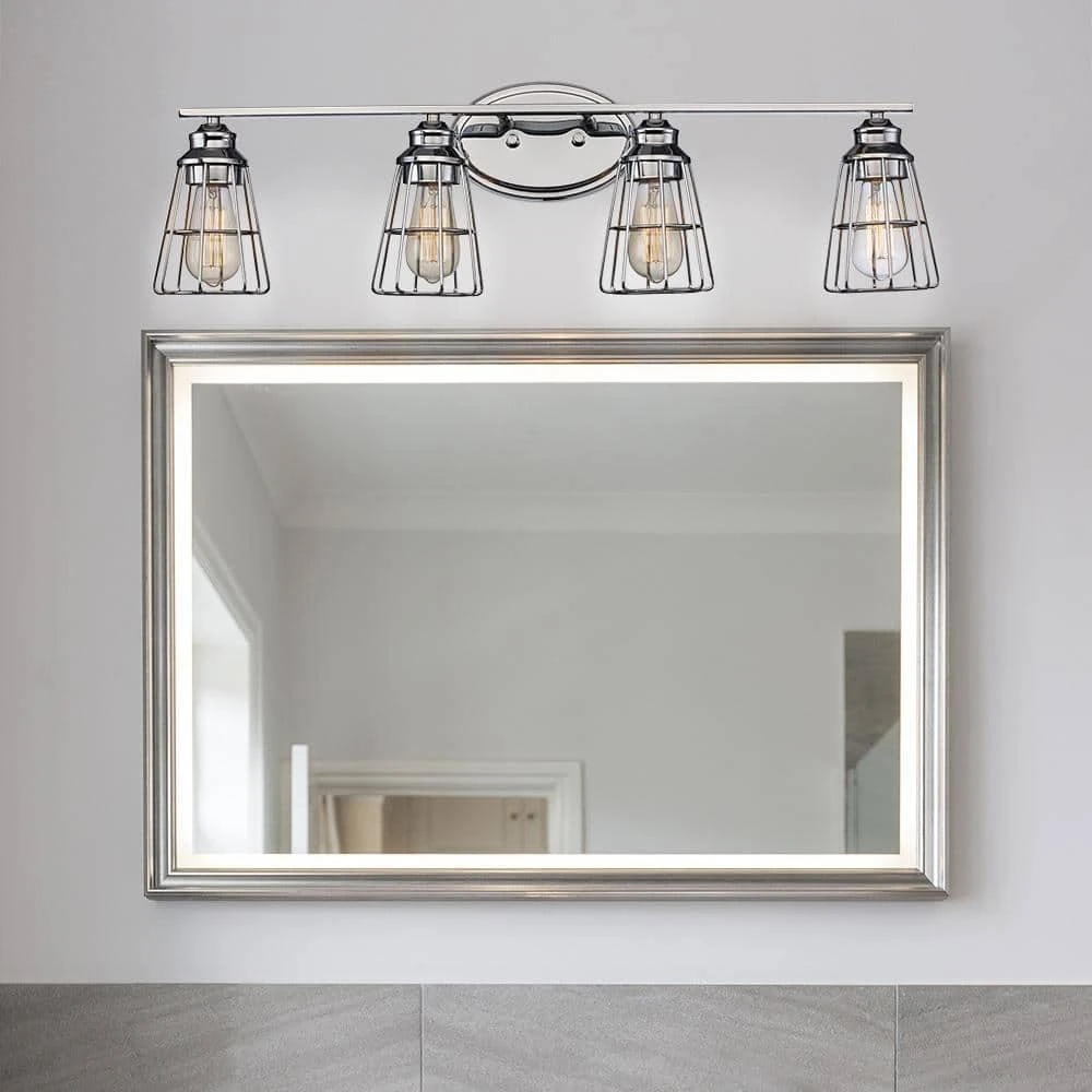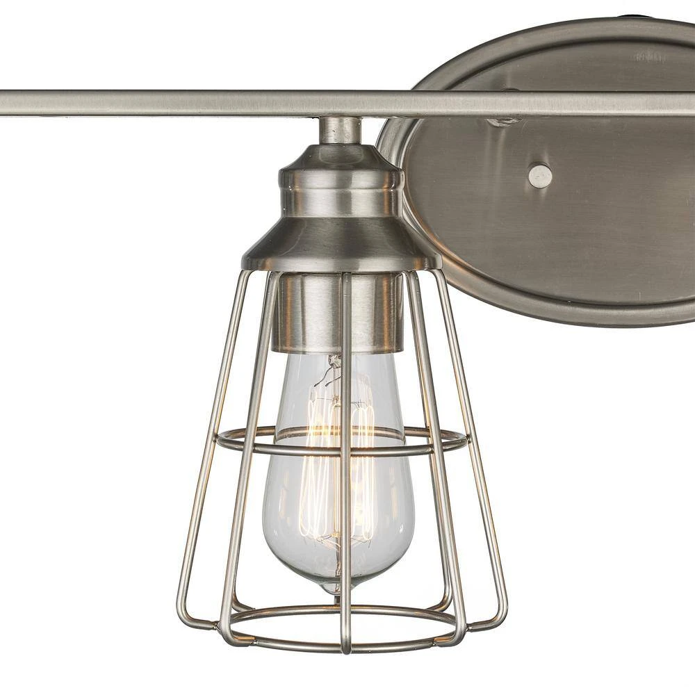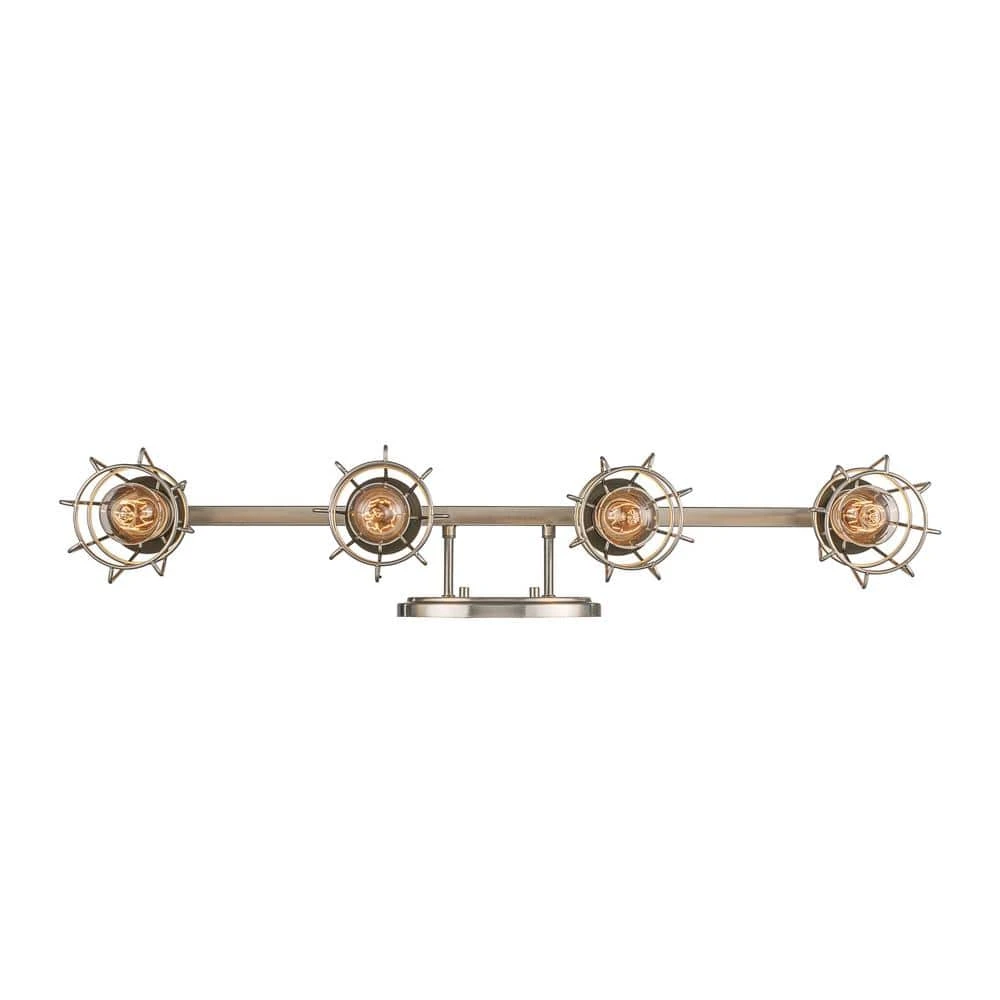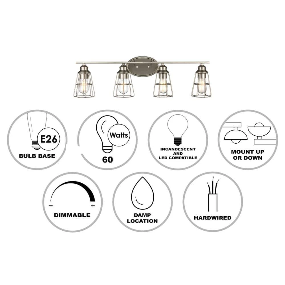 The Solution Collection exhibits industrial style vanity lighting, suitable for a variety of bathroom and powder room applications. Each piece in the series includes cone-shaped metal cage shades attached to a linear support arm and matching oval backplate. The Solution 32 inch vanity bar is finished in brushed nickel, designed to coordinate seamlessly with existing bathroom hardware. The four light design offers ample task lighting, and is suitable for medium to large sized vanities. Vintage, Edison style bulbs are recommended to capitalize on the industrial tone of the piece, not included. This vanity light can be mounted with the shades pointing upwards or downwards for a directional illumination and a customized look.
