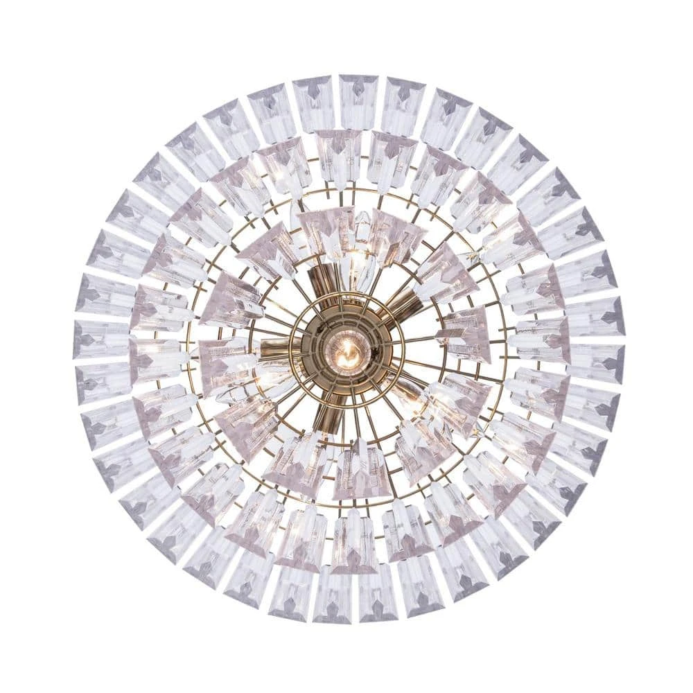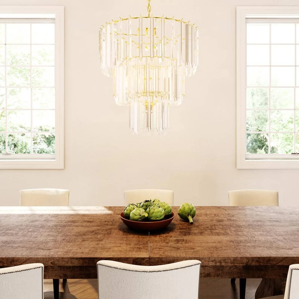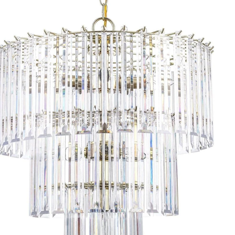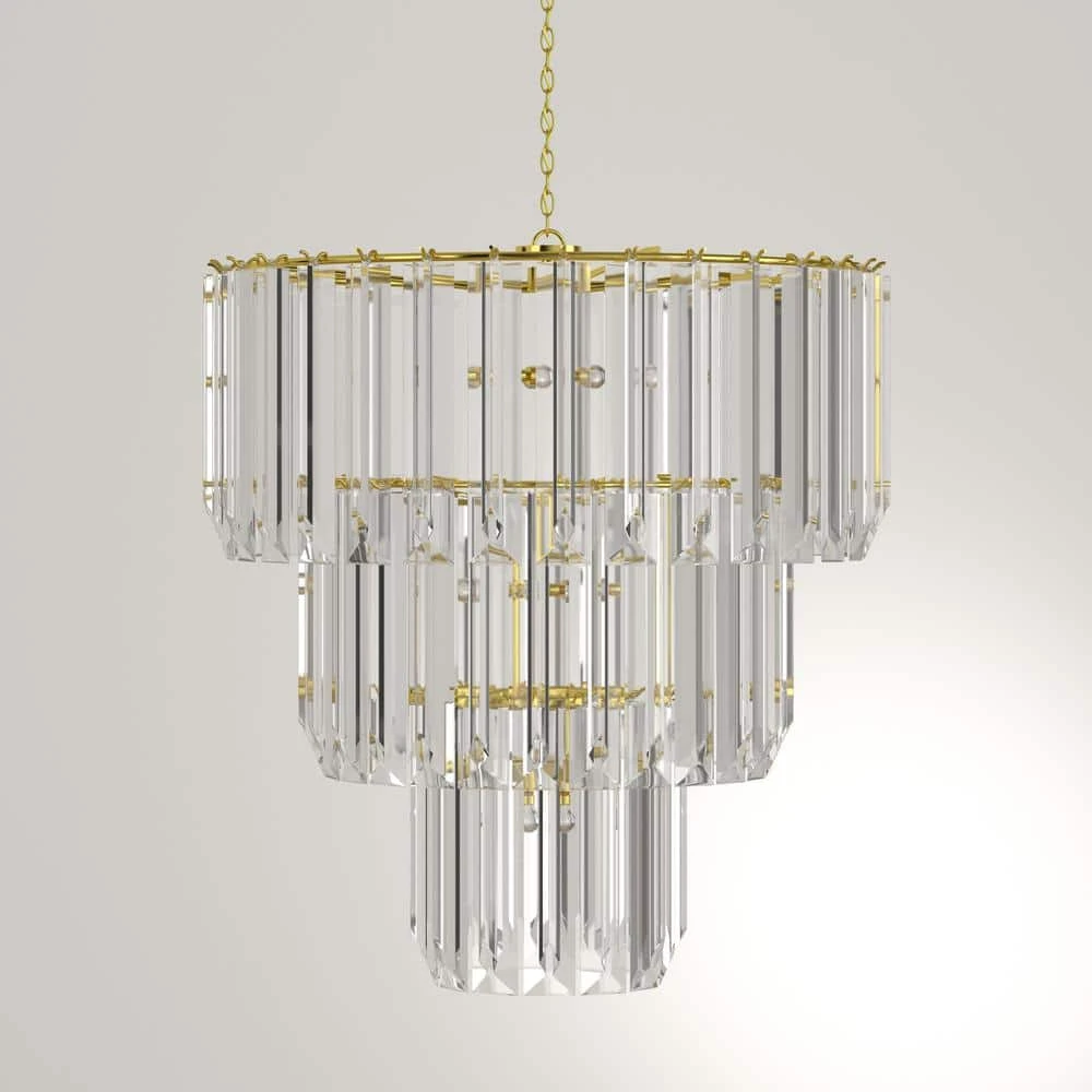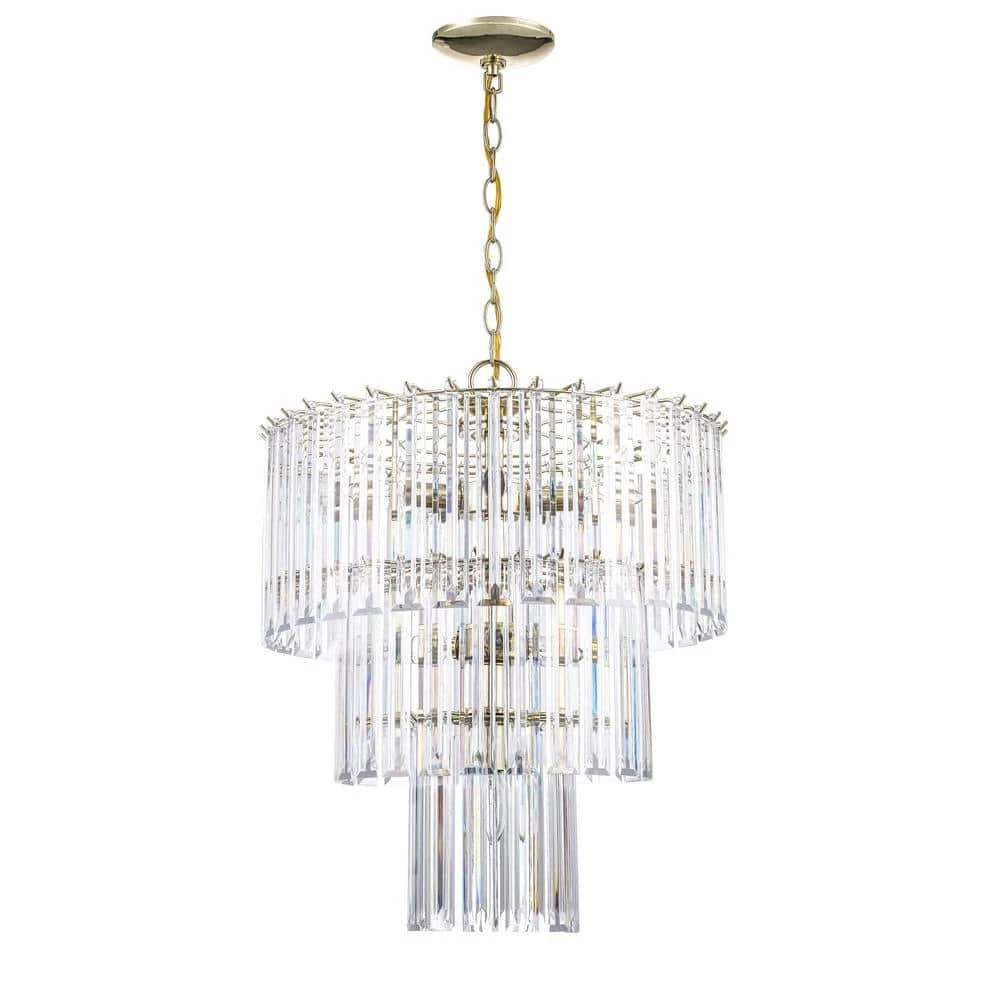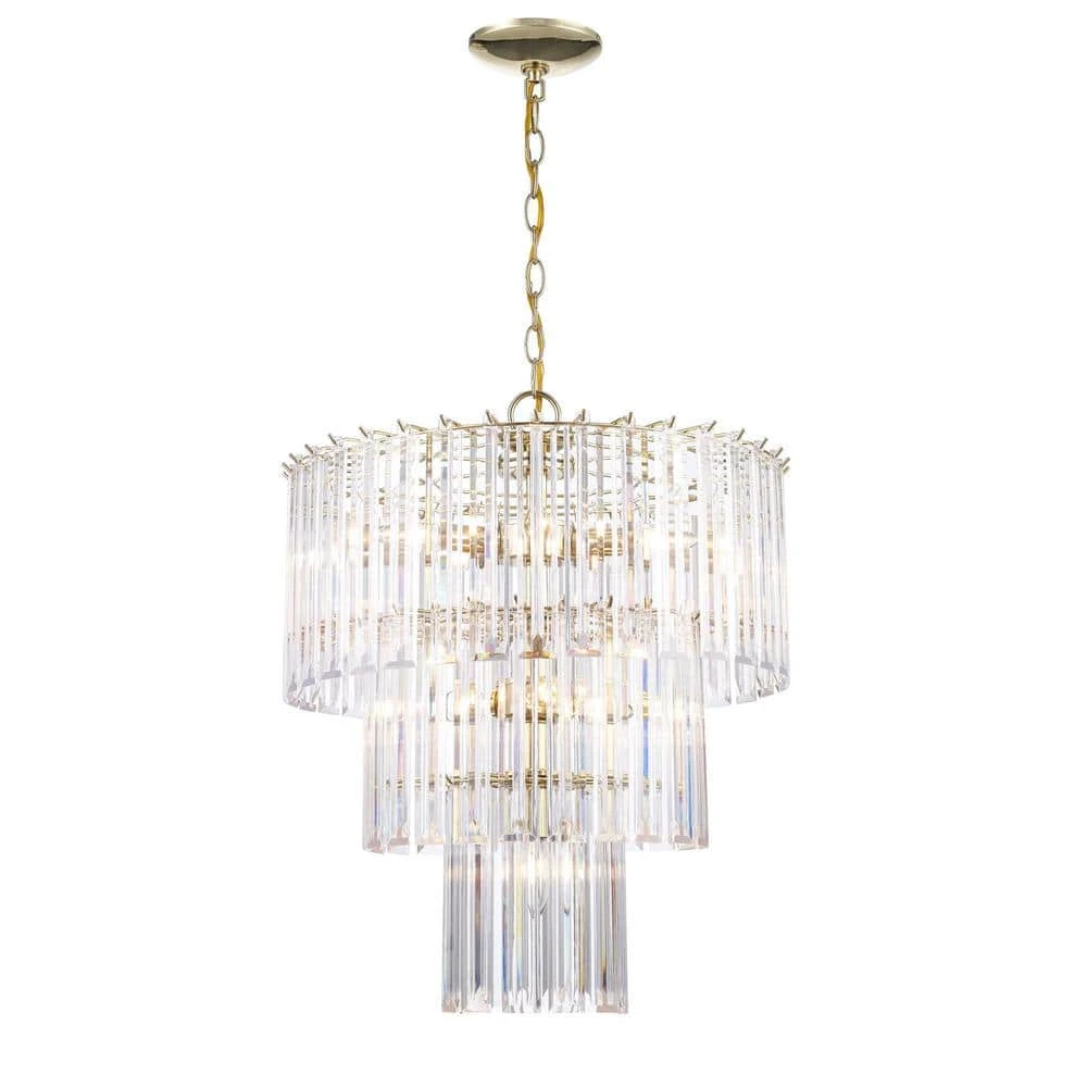 The Tranquility Collection supplies ample lighting for your daily needs while adding a layer of glam style to your home’s decor. The Tranquility 20 inch round tiered chandelier is a 9-light fixture that has a classic designer look, contemporary styling, and glimmers with layered strands of beveled acrylic tapers. The designer inspired three-tier acrylic shade looks beautiful with the lights on or off, offering a unique focal point during the day or at night. The polished brass finish is designed to coordinate with a variety of existing decor styles and reflect the light for even brighter illumination. A matching chain is included, offering an adjustable height and sloped ceiling compatibility. This chandelier’s large size and round shape is ideal for use over kitchen and dining room tables, and grand entryways. Shop the Tranquility Collection for coordinating interior lighting pieces.