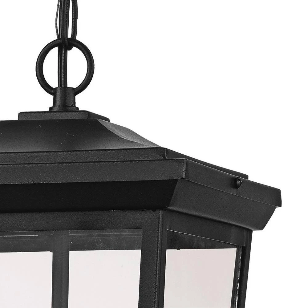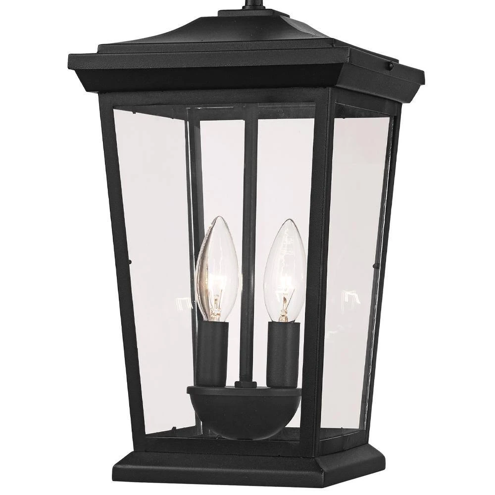 The Turlock Collection exhibits transitional style outdoor lighting designed to coordinate with a variety of home types and decor styles, from modern to farmhouse. The Turlock 13 inch tall pendant features a simple tapered rectangular frame with a carved roof and open bottom. The pendant brings ambient lighting to overhang areas and porches without occupying any usable space. Two candelabra bulbs are visible inside clear glass windows, allowing ample light output for small and large exterior living spaces. A sleek black finish completes the look and makes it easy to coordinate with existing black finished outdoor lights and hardware. The linear pendant body hangs from a matching black chain, offering an adjustable height and sloped ceiling compatibility.