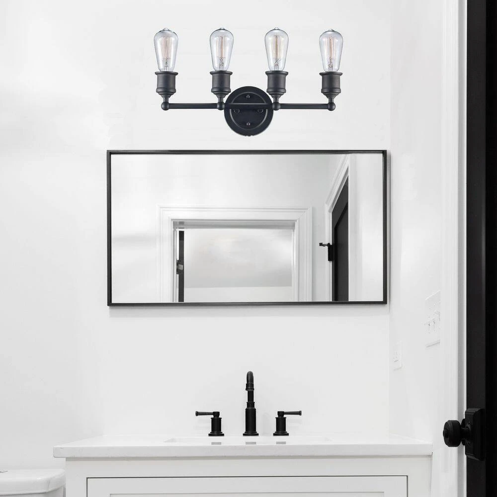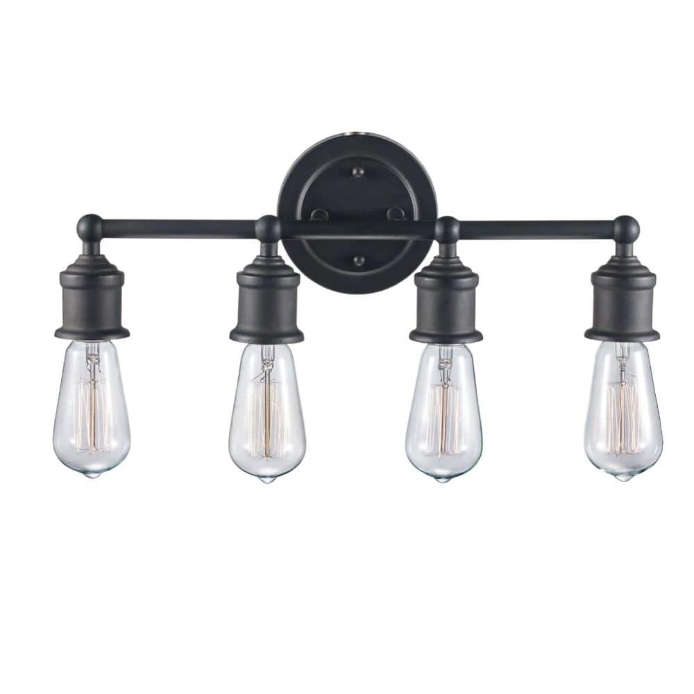 The Underwood Collection from Bel Air presents farmhouse inspired vanity lighting with unique shade-less designs, ideal for rustic and transitional styled bathroom and powder rooms. The Underwood 17.25 inch wide vanity bar features a warm, rubbed oil bronze finish that coordinates seamlessly with existing bathroom hardware and other bronze vanity fixtures. The four bulbs are on full display without any glass or fabric shades to interrupt their illumination. Each bulb attaches firmly to a straight arm connected to a matching round wall plate. This minimalist collection is great for bringing functional task lighting to your home, and can be mounted with the bulbs facing upwards or downwards to customize the look.