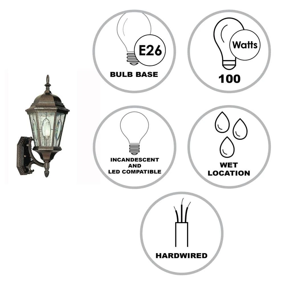 The Villa Nueva Collection from Bel Air presents decorative outdoor lighting with traditional, craftsman appeal. The Villa Nueva 20 inch tall outdoor wall light is the perfect choice for providing bright and functional illumination to your home’s exterior walkways, porches, decks, and driveway spaces. The six-sided frame includes water glass sides with a clear, oval glass detail in the middle of each. The metal roof and decorative finial are finished in bronze to coordinate with the rest of the piece. This coach lantern is mounted with the body of the fixture in the “up” position, supported by a decorative reaching arm that mounts firmly to a matching wall plate. The single 100-watt bulb inside provides ample illumination for medium to larger exterior spaces. Shop the Villa Nueva Collection for additional finishes and outdoor lighting styles.