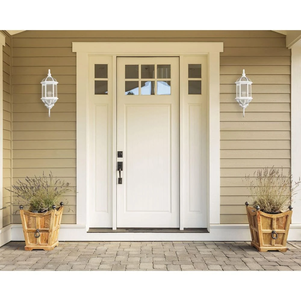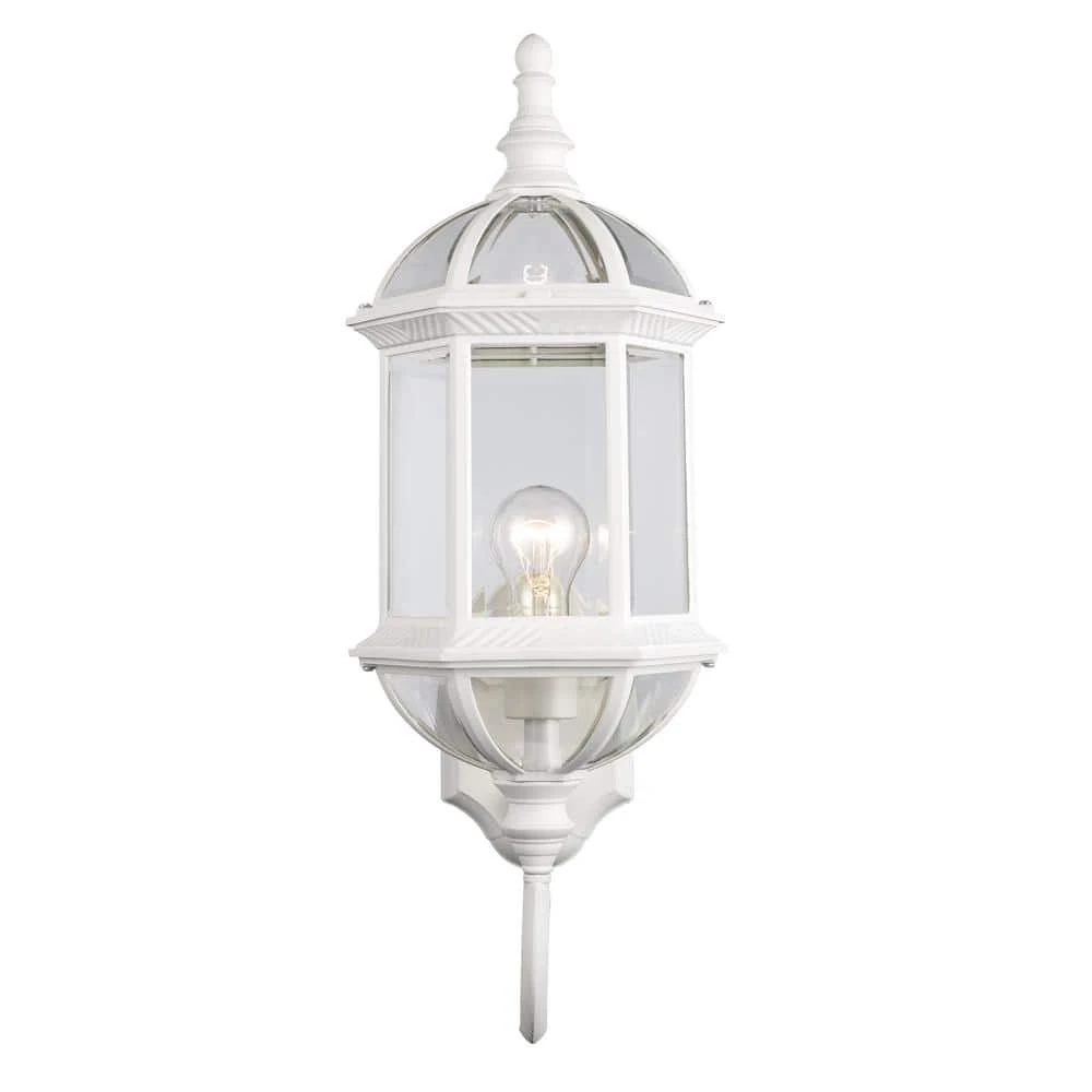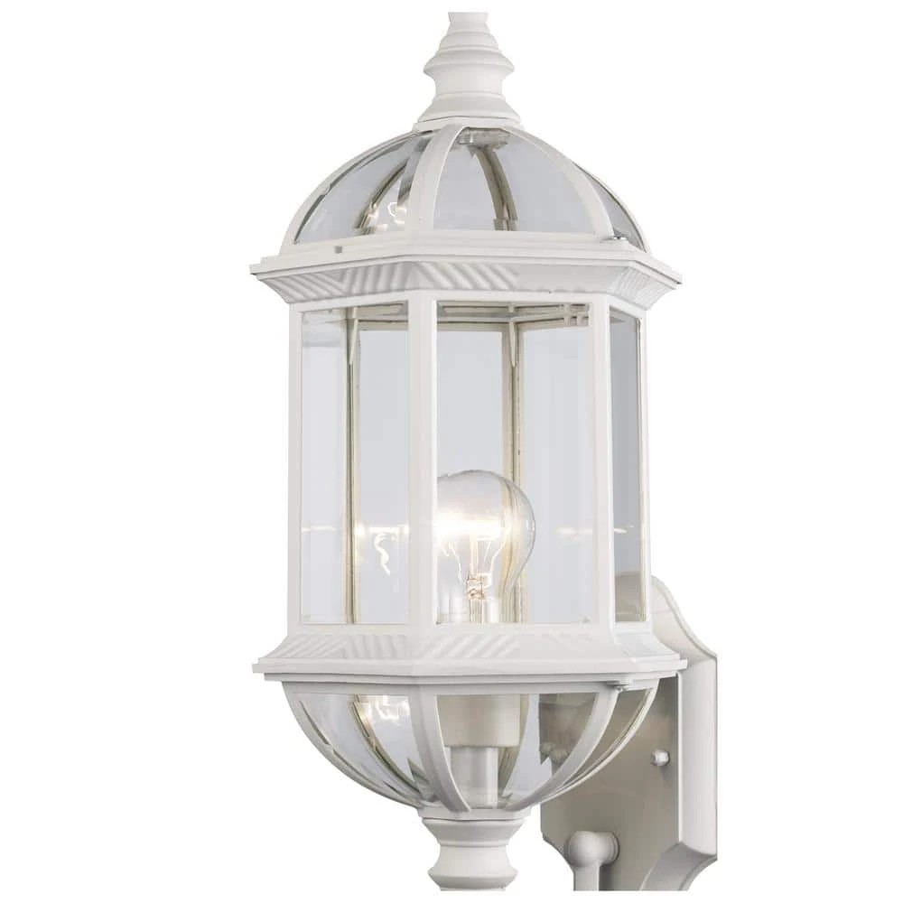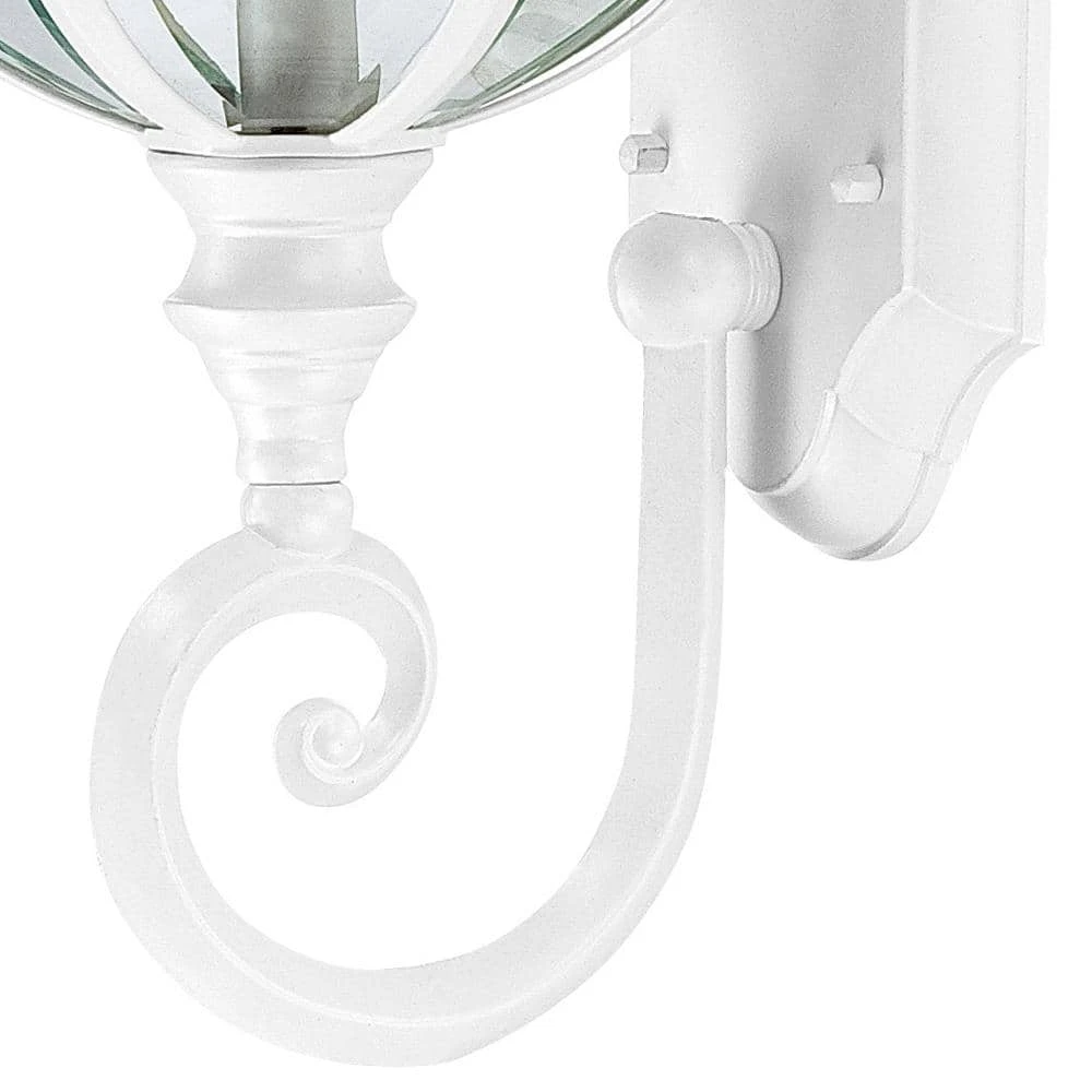 The Wentworth Collection from Bel Air presents classic style exterior lighting with rounded housings, steeped roofs, and scroll arms. Each exterior wall light in the series features beveled clear glass and decorative trim along the metal frame. The Wentworth 22.25 inch tall outdoor wall light is finished in white to coordinate with a variety of home styles from traditional to transitional. The coach-style lantern sits atop a scroll arm and remains firmly attached to the matching white wall plate to hold up in harsh weather conditions. A single light bulb is housed inside the fixture, providing ample illumination out from behind the clear glass. This wall sconce was designed to provide ample light in landscape areas, porches, and along walkways.