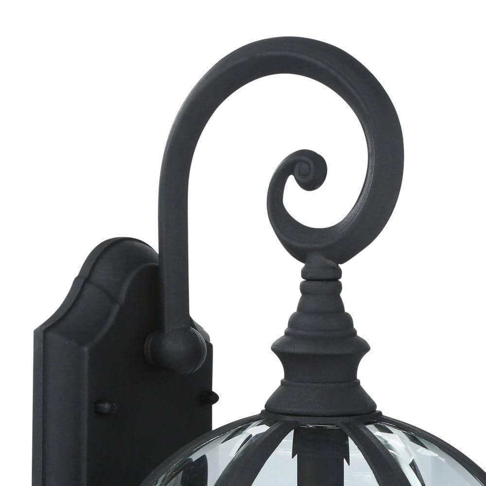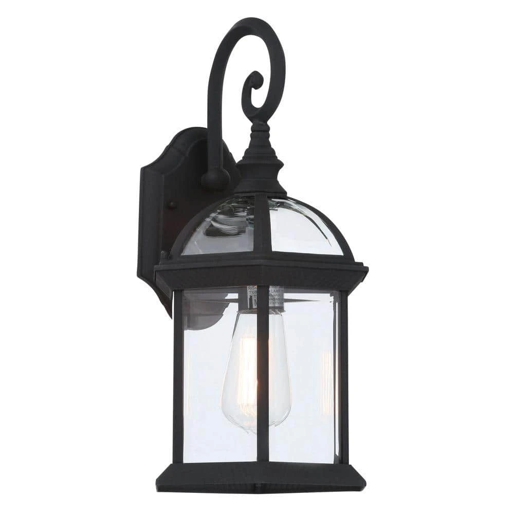 The Wentworth Collection features classic style exterior lighting with rounded housings, steeped roofs, and decorative scroll arms. Each exterior wall light features beveled glass edges and braided trim along the metal frame. This Wentworth 7.5 inch wide black-finished wall lantern is the smallest in the collection, and includes a matching decorative wall plate for mounting. The fixture is open at the bottom to allow easy access to the single 60-watt down light bulb. This wall sconce was designed to provide ample light in landscape areas, porches, and along walkways.