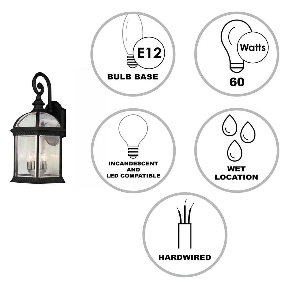 The Wentworth Collection from Bel Air exhibits classic style exterior lighting with rounded housings, steeped roofs, and decorative scroll elements. The Wentworth 19 inch tall wall lantern features a hanging design with the lantern body and glass shade seeming to ‘hang’ on the scroll arm while remaining firmly affixed to the wall plate for stability. The piece is finished in black, designed to coordinate with existing home fixtures. Three 60-watt candelabra bulbs are housed behind the clear glass, offering ample illumination in porch entryways, patios, driveways, and decks. The bulbs can be easily accessed through the open bottom of the fixture. Mount this wall light as a single unit, or pair in multiples on either side of a garage door or grand entryway.