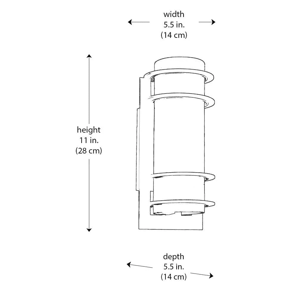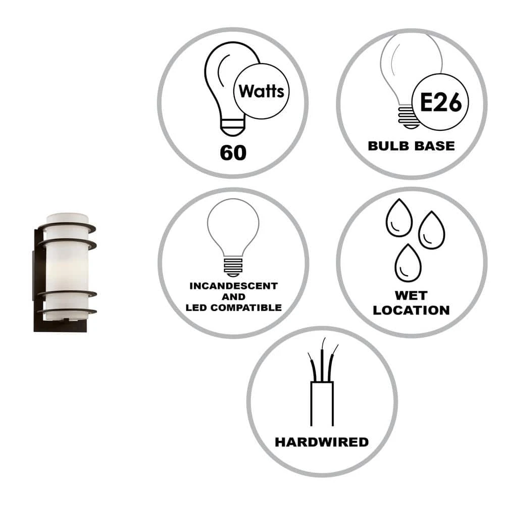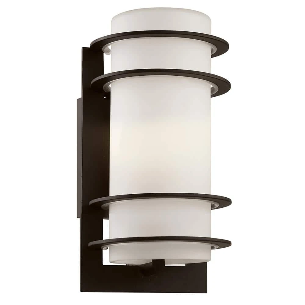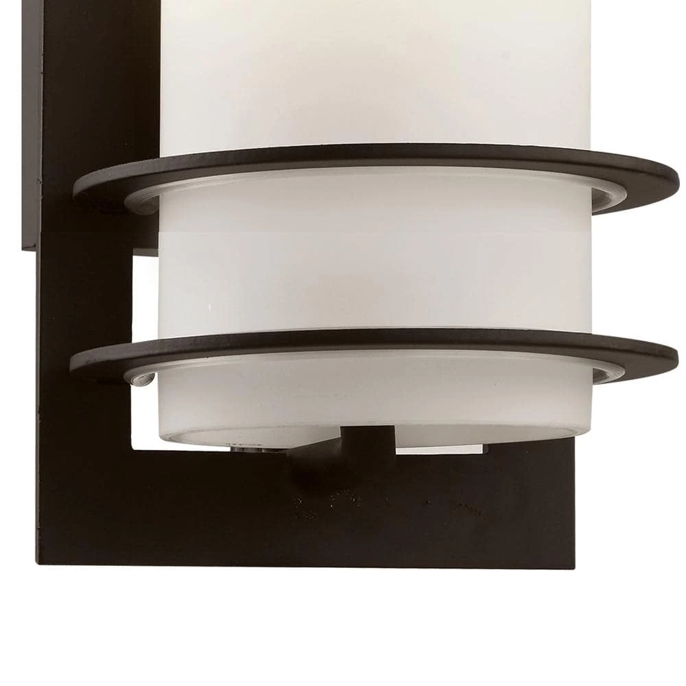 The Zephyr Collection from Bel Air presents modern outdoor wall lighting with contemporary finishes, sleek lines, and compact designs. The Zephyr 11 inch sconce is the smallest in the collection and features an immaculate black finish with a white frosted glass cylinder shade. The cross bar metal framing is dual purpose; it provides support and protects the glass from breakage in harsh weather conditions, and highlights the modern tone of the piece. An opening at the base of the glass shade allows for an easy access to change the bulb, as well as allowing bright directional lighting in the space below. Mount this wall sconce vertically along outdoor pathways and steps, on either side of a garage door to illuminate your home’s driveway, or near an exterior entryway.